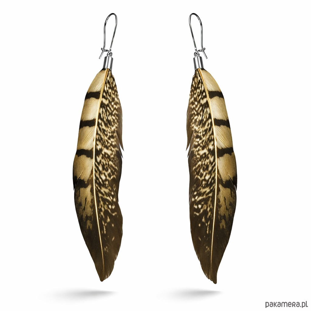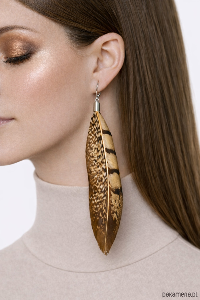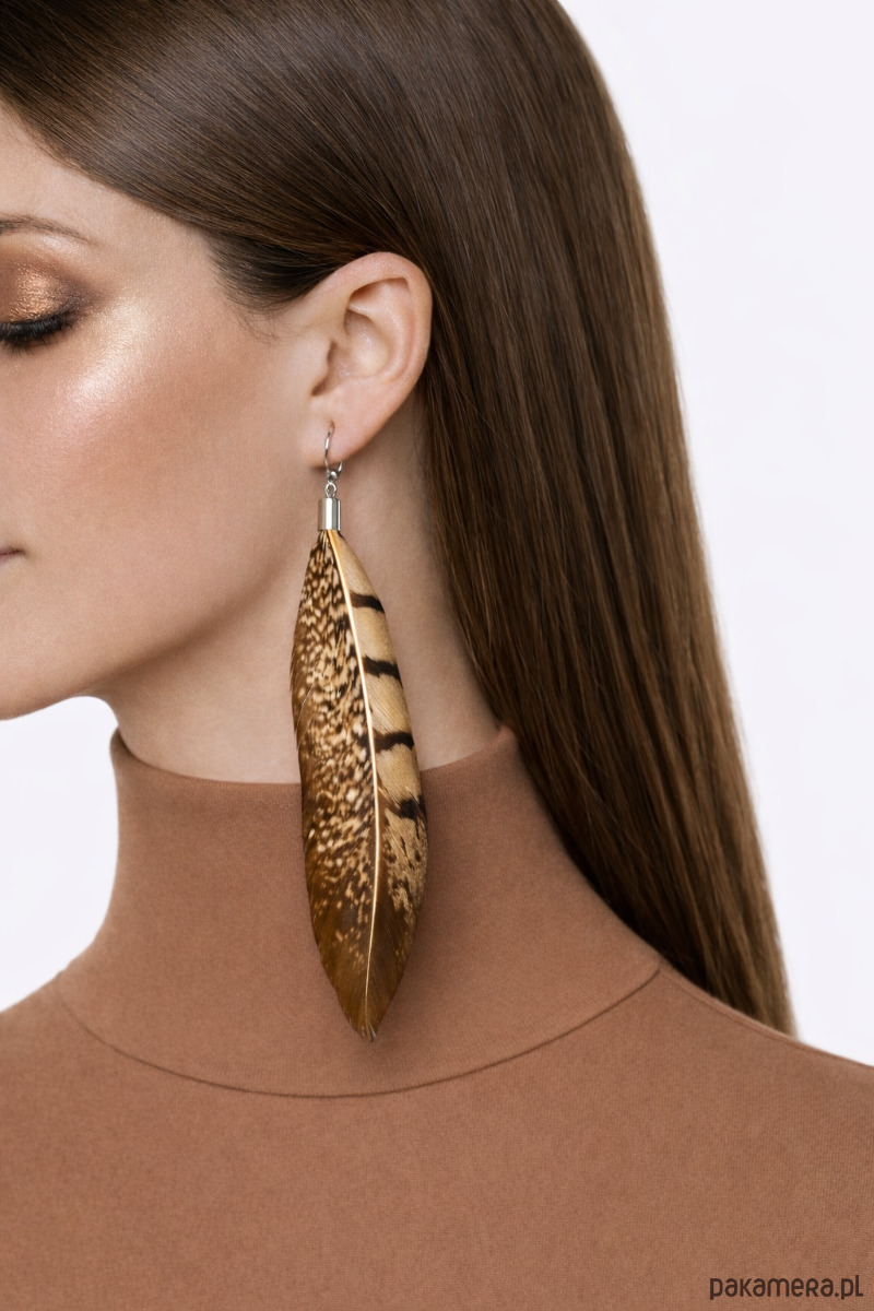 Naturalne pióra w szlachetnych odcieniach złota i brązu subtelnie przyciągają wzrok i podkreślają unikatowy charakter biżuterii.