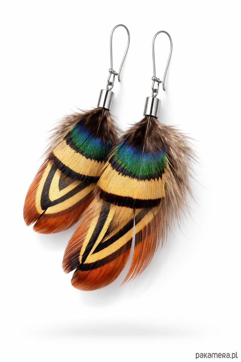 Kolczyki Pluma to elegancka kompozycja oparta na starannie wyselekcjonowanych piórach bażancich, które nadają im charakterystyczny, kontrastowy rysunek czerni i kremowej bieli oraz ciepłe, miodowo-rdzawe wykończenie. Górny akcent o zielono-turkusowym, metalicznym połysku pięknie odbija światło i dodaje całości wyrazistości.