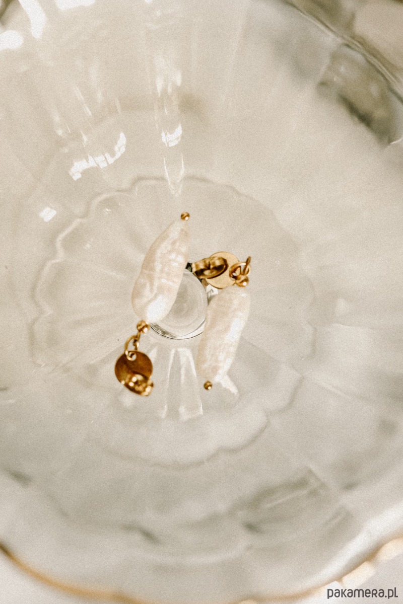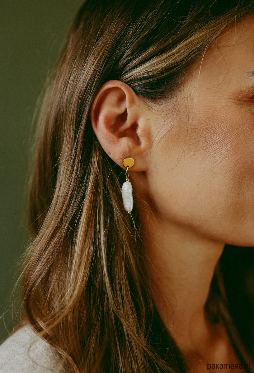 Kolczyki wykonane ręcznie z podłużnej nieregularnej perły naturalnej i stali szlachetne.