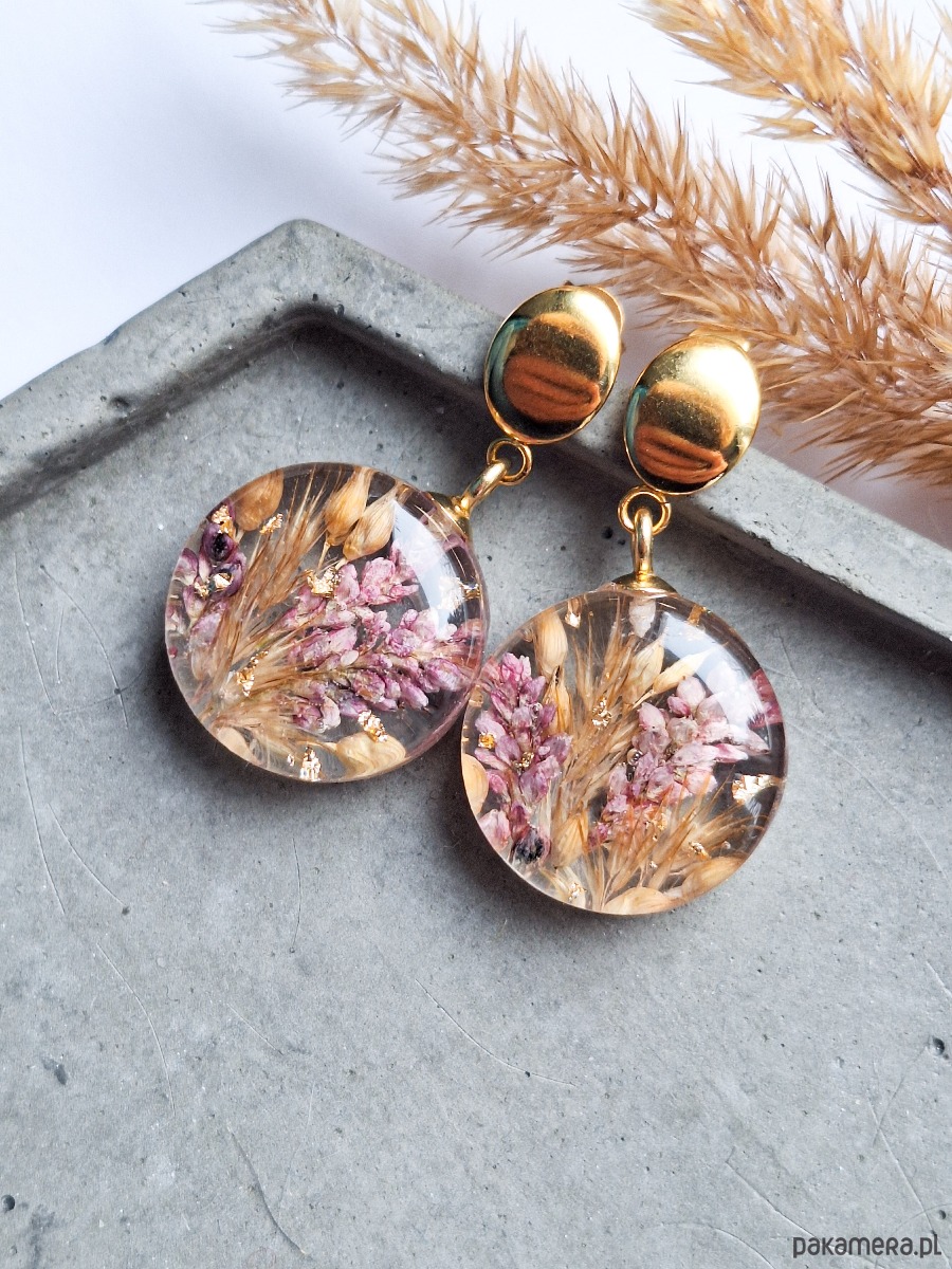 Urocze kolczyki z zatopionymi polnymi kwiatami i płatkami złota. Wykonane z wysokiej klasy żywicy, która nie zmienia koloru pod wpływem promieniowania UV oraz wysokiej jakości stali chirurgicznej.