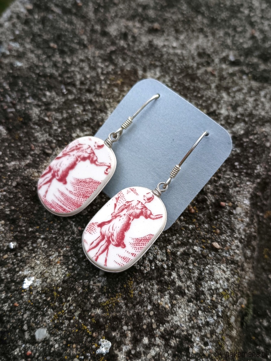 Oto wiszące kolczyki, które wykonałam z fragmentów stłuczonych talerzy Villeroy & Boch Burgenland w ciemnoczerwonym kolorze. Kawałki stłuczki oszlifowałam w owalne kształty, oprawiłam w drucik i połączyłam ze srebrnymi biglami. Ceramikę zeszlifowałam również z grubości - jest cieńsza niż pierwotnie, dzięki czemu kolczyki nie są masywne. Brzegi i tył pokryłam lakierem, co sprawia, że nie brudzą się i nie chłoną wilgoci. Oprawa oraz bigle (zapięcia) wykonane są ze srebra próby 925 - wyrób jest antyalergiczny. Wymiary elementów ceramicznych: 17 x 23 mm. Waga jednego kolczyka: 2,3 g. Unikat - każdy z moich wyrobów występuje w jednym egzemplarzu. Upcykling - nie reprodukuję wykorzystywanych wzorów, niczego nie domalowuję - wykorzystuję wyłącznie oryginalne naczynia i motywy, które się na nich znajdują. Tym samym, stłuczce z odzysku nadaję nowe życie.