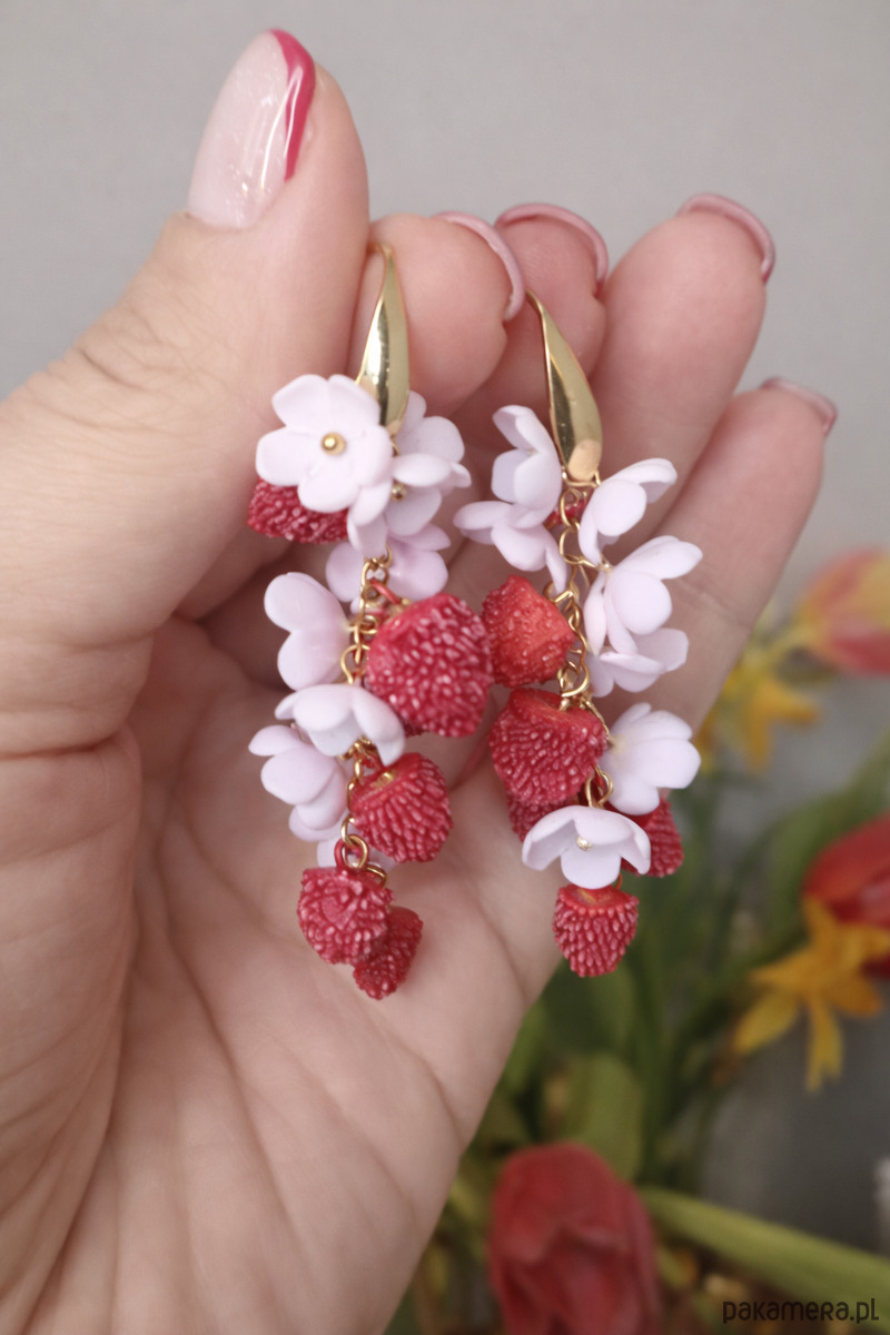 Kolczyki z poziomkami i niezapominajkami. Handmade Polska. Polimerowa glina