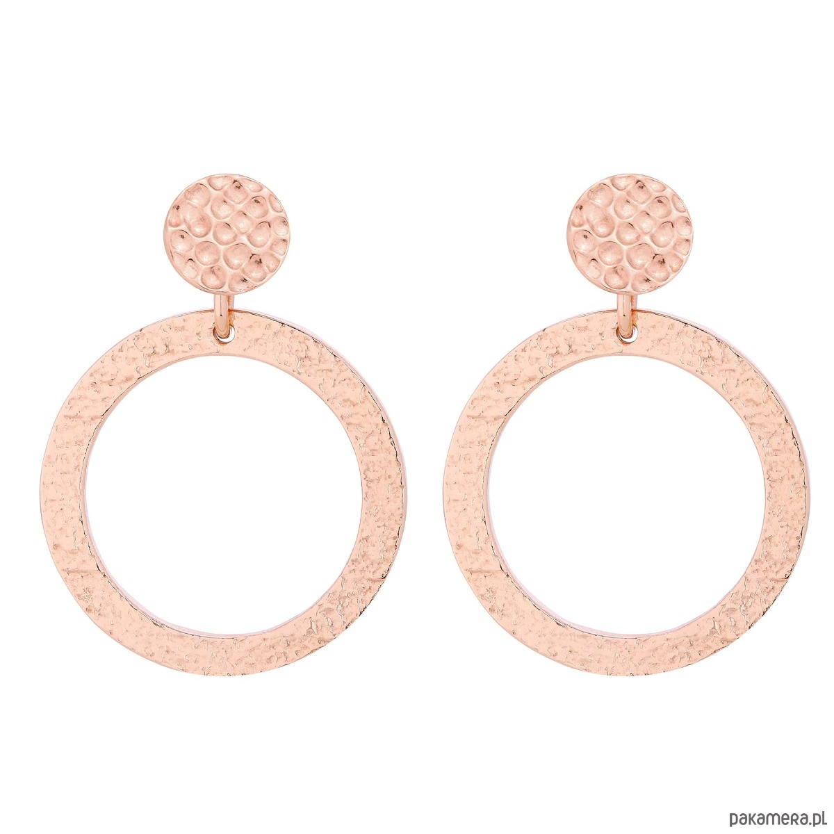 Złote długie kolczyki z chropowatymi obręczami. Zapinane na sztyft. Kolczyki posiadają zapięcia (baranki). Całość wykonana ze srebra 925 powlekanego 18 karatowym różowym złotem.