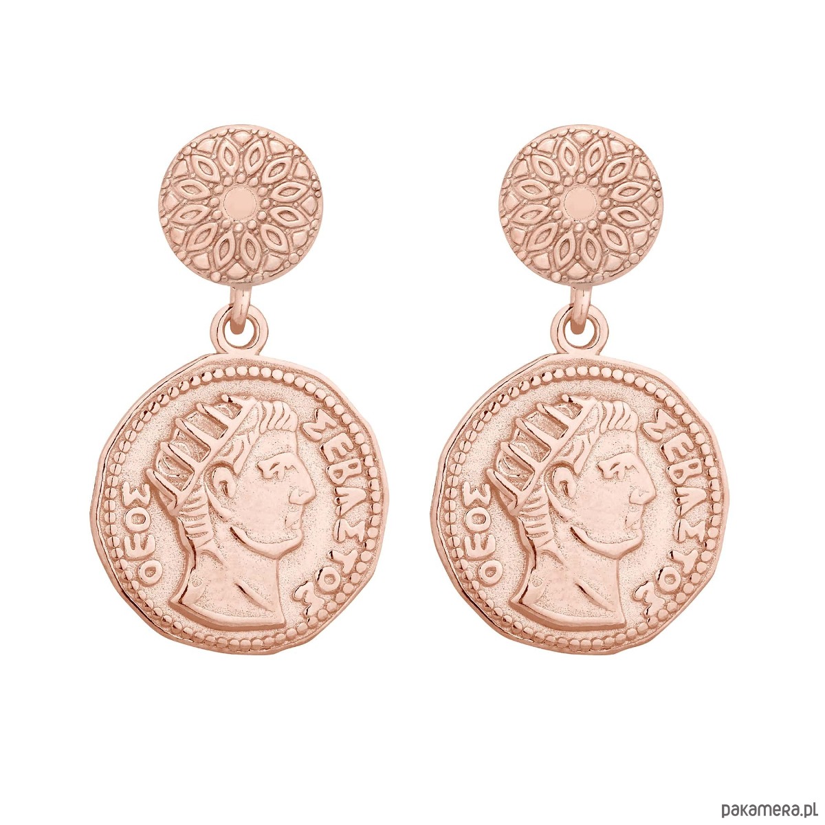 Złote kolczyki z monetami. Zapinane na sztyfty. Całość wykonana ze srebra 925 powlekanego 18 karatowym różowym złotem.