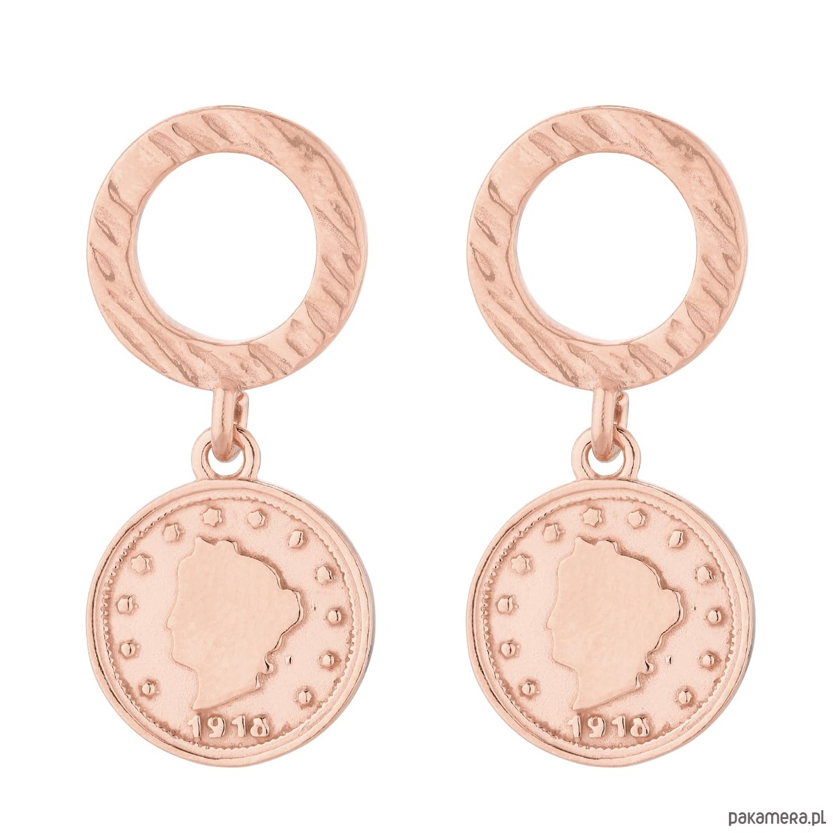 Złote kolczyki z chropowatym kółeczkiem i monetą. Zapinane na sztyft. Kolczyki posiadają zapięcia (baranki). Całość wykonana ze srebra 925 powlekanego 18 karatowym różowym złotem.