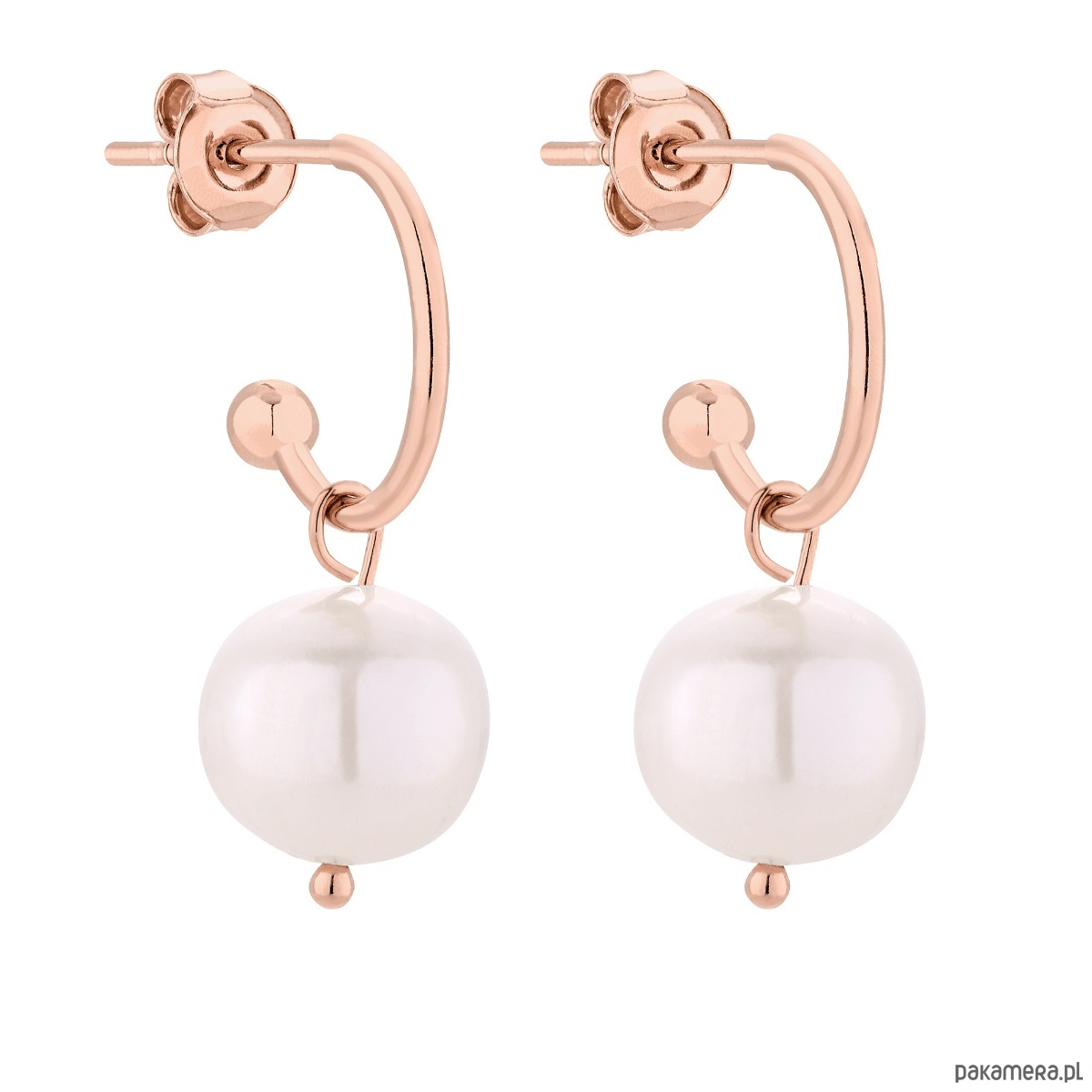 Złote kolczyki z naturalnymi perłami. Całość wykonana ze srebra 925 powlekanego 18 karatowym różowym złotem. Perła jest okrągła, nieregularna, unikatowa i może różnić się od tej na zdjęciu. Zapinane na sztyft. Kolczyki posiadają zapięcia (baranki).