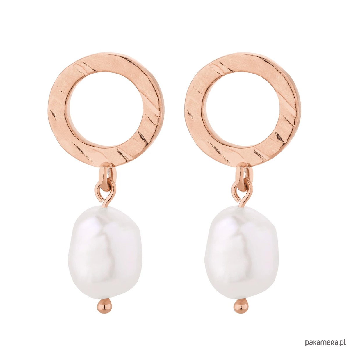 Złote kolczyki z chropowatymi kółeczkami i naturalnymi nieregularnymi perłami. Całość wykonana ze srebra 925 powlekanego 18 karatowym różowym złotem. Zapinane na sztyft. Kolczyki posiadają zapięcia (baranki).