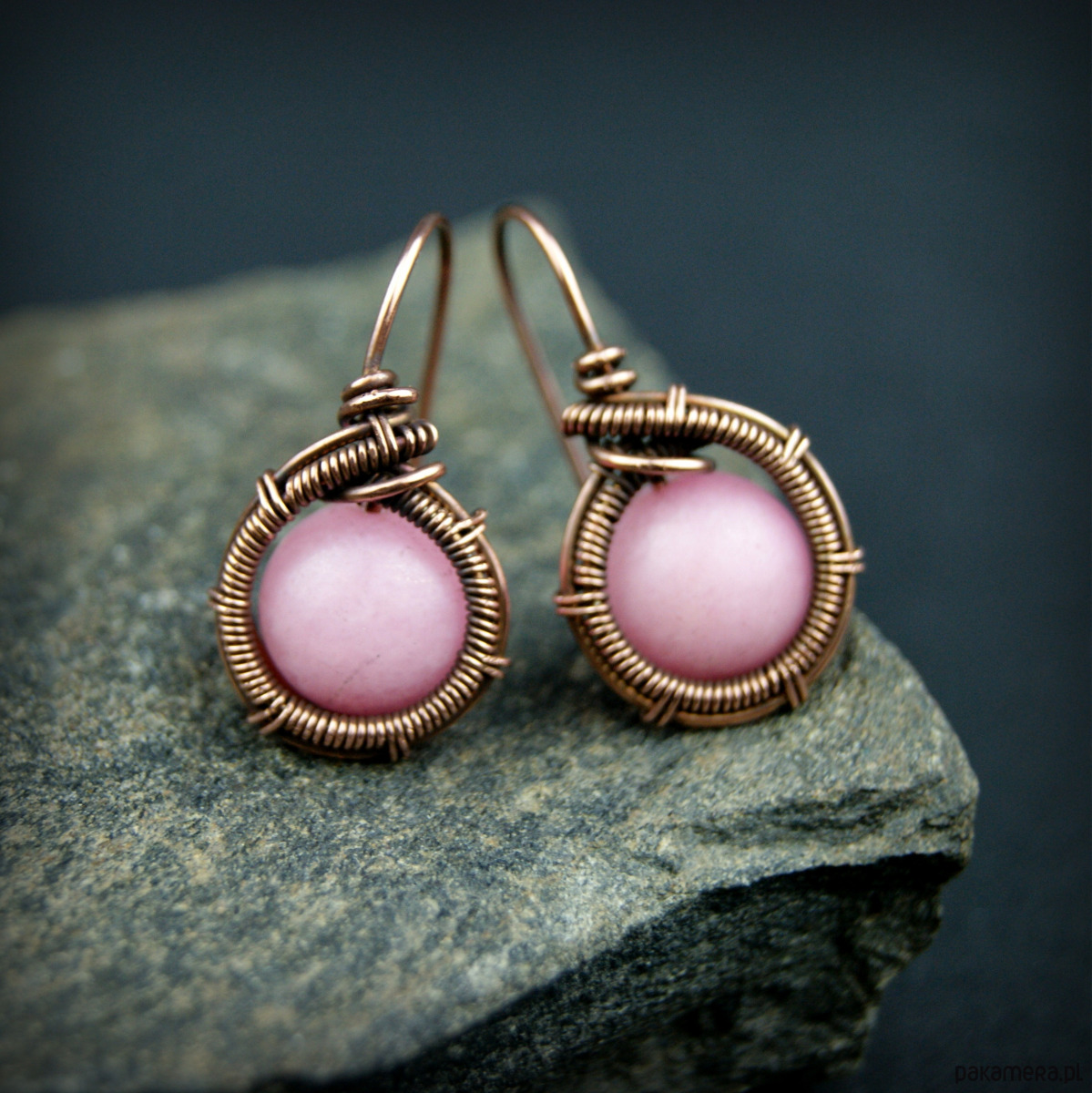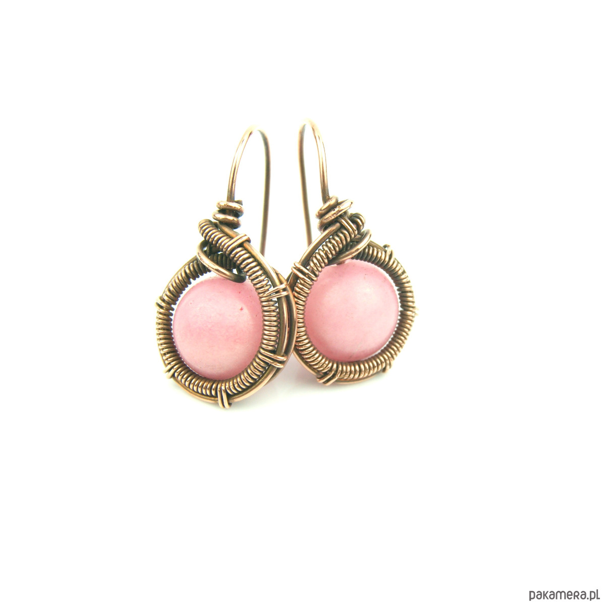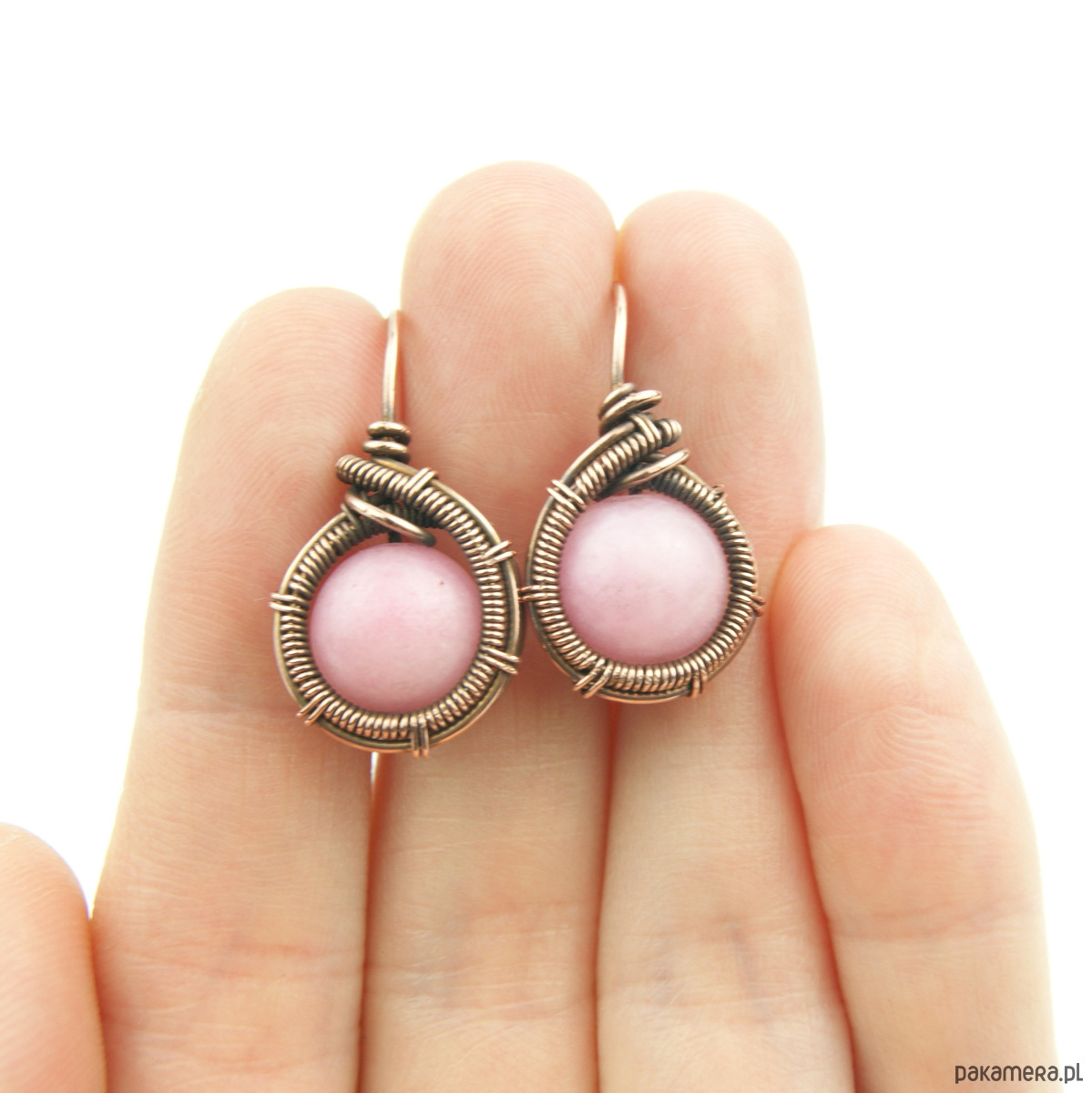Kolczyki w całości wykonane w pracochłonnej technice wire wrapping. Do stworzenia kolczyków użyto różowych kamieni jadeitu oraz drutu miedzianego, całość oksydowano. Kolczyki są lekkie i delikatne.
