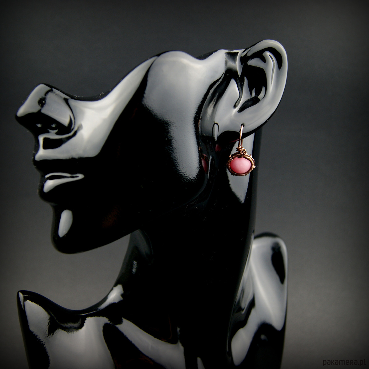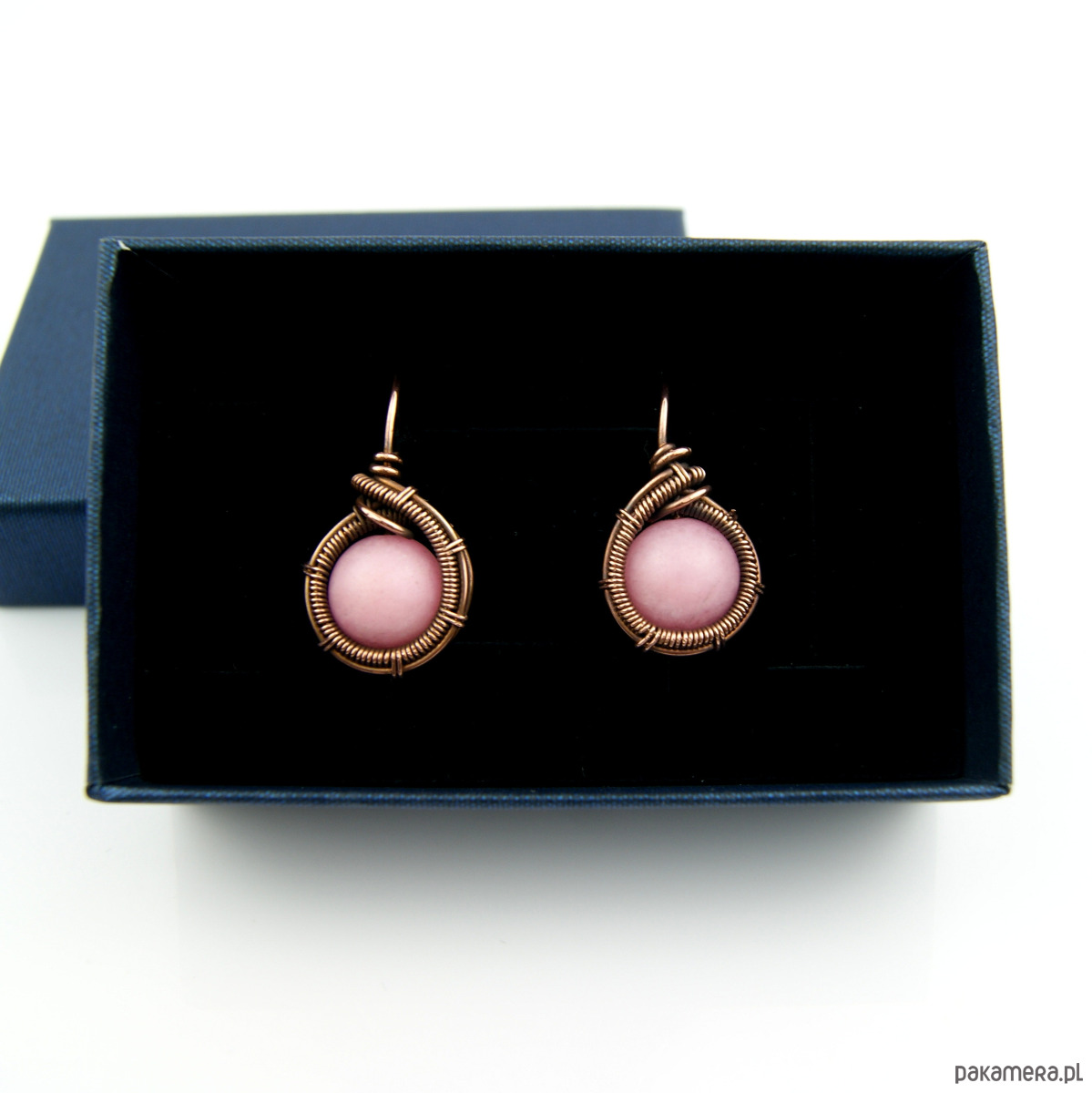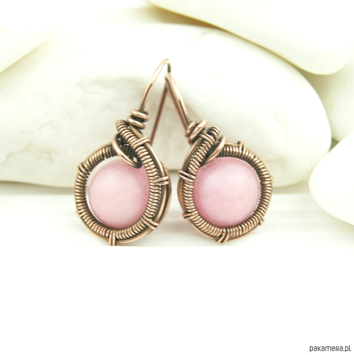 Kolczyki w całości wykonane w pracochłonnej technice wire wrapping. Do stworzenia kolczyków użyto różowych kamieni jadeitu oraz drutu miedzianego, całość oksydowano. Kolczyki są lekkie i delikatne.
