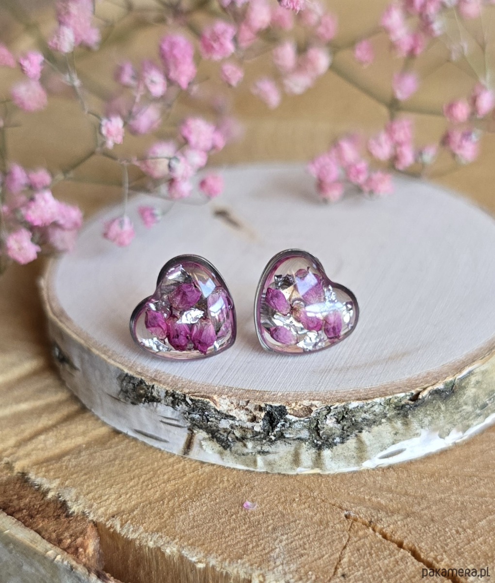 Kolczyki z różowymi kwiatami srebrne kwiaty wrzos serca serduszka