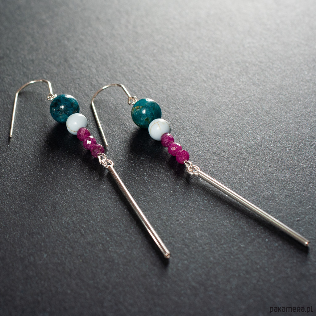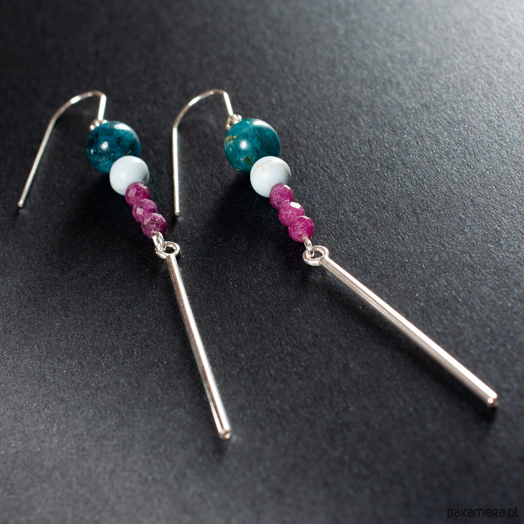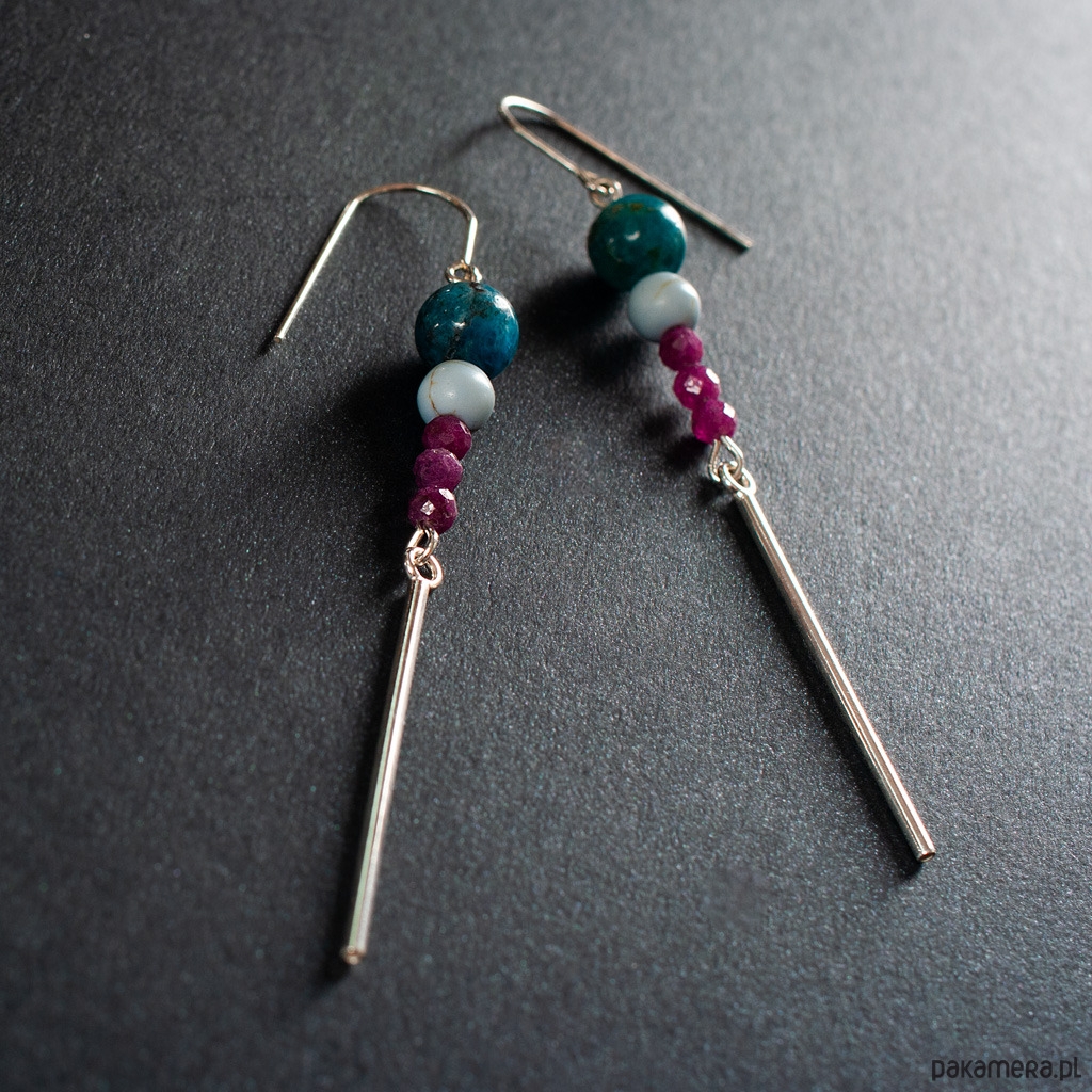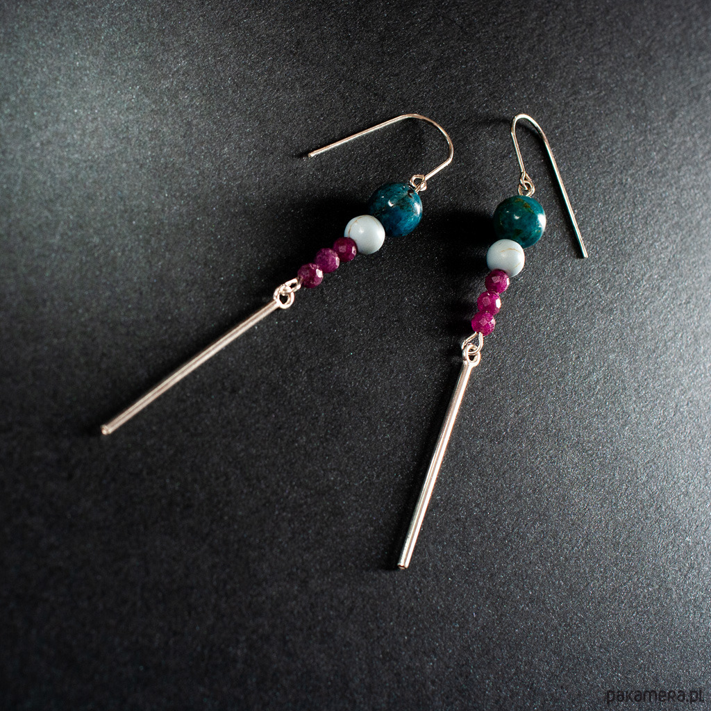 Kolczyki z kolekcji SZAMANKA z rubinem, apatytem, howlitem i srebrem 925. Długość kolczyków z biglem 8 cm. Kolczyki wykonane ręcznie według własnego projektu w pracowni Anillo. Biżuterię przesyłamy w eleganckim kartoniku.
