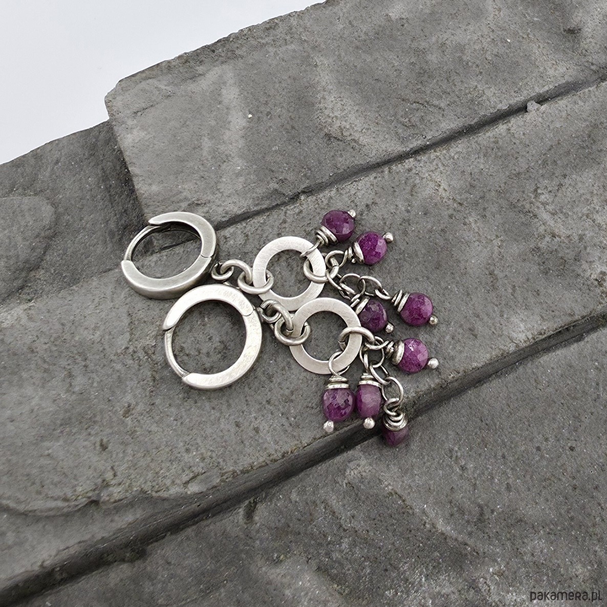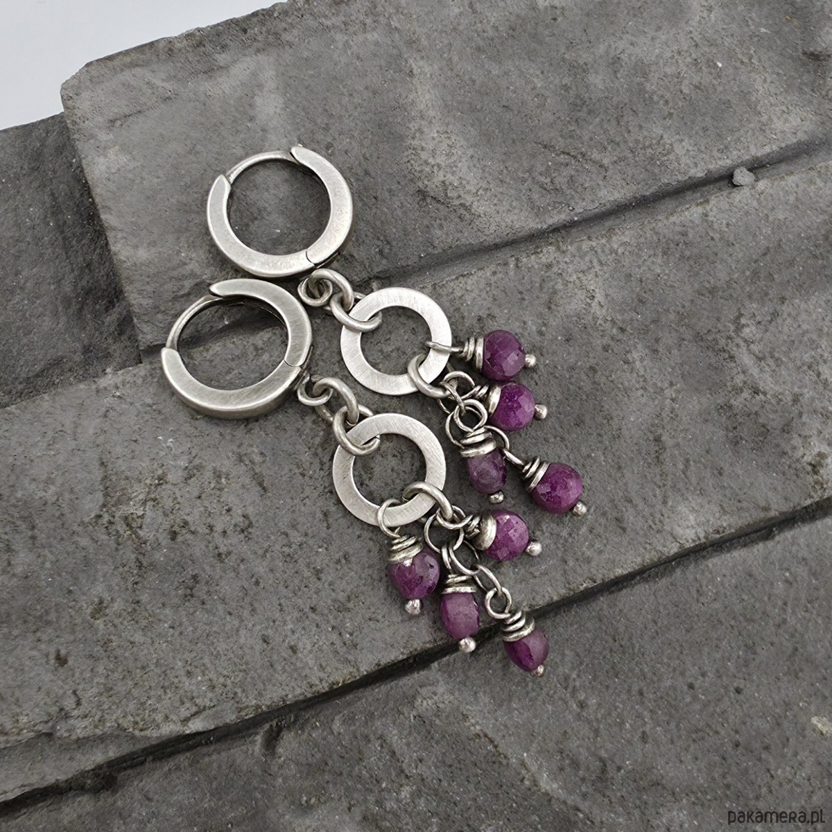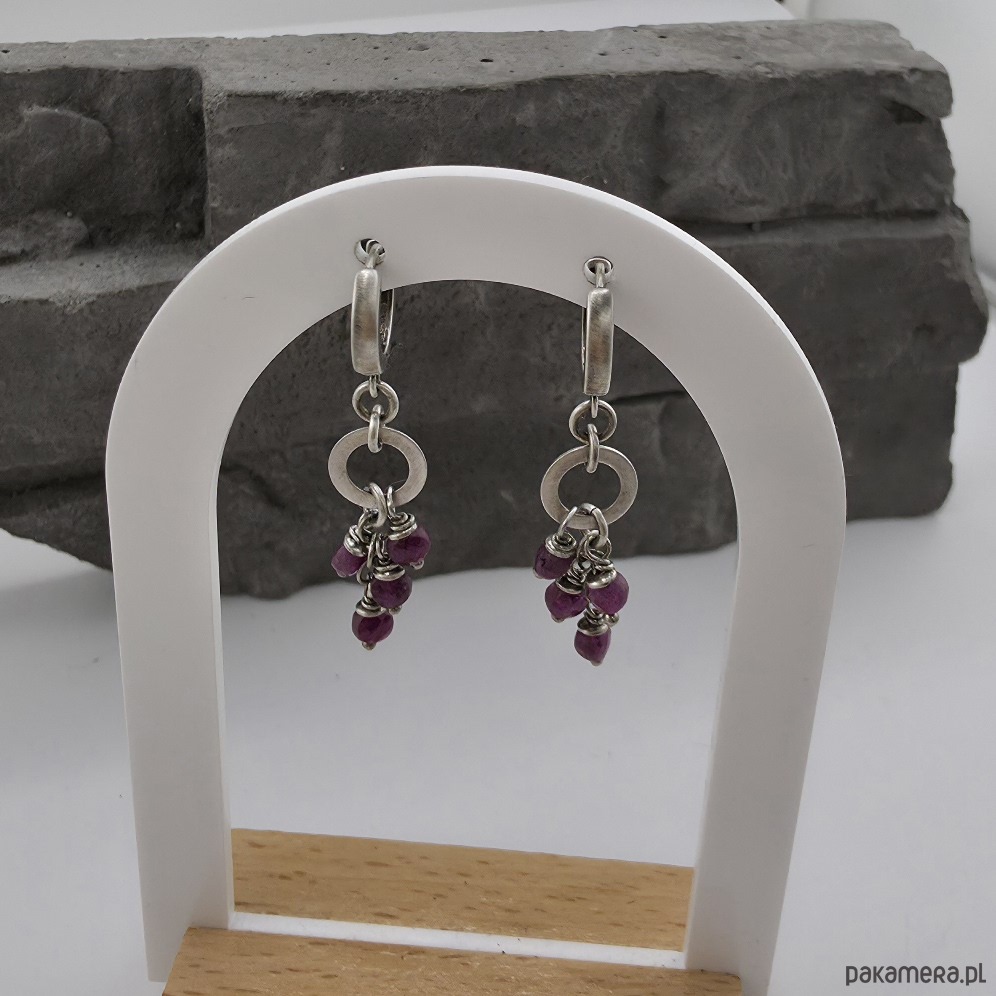 Kobiece i pelne uroku kolczyki na co dzień i nie tylko. Wykonane w całości z oksydowanego srebra próby 925 oraz fasetowanych pastylek naturalnego rubinu wiekości ok. 4 mm. Całkowita długość kolczyków to 4,5 cm. Ozdobnie zapakowane.
