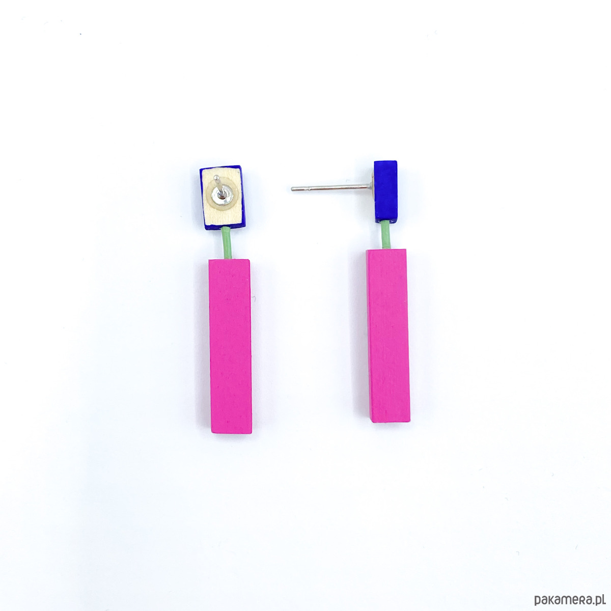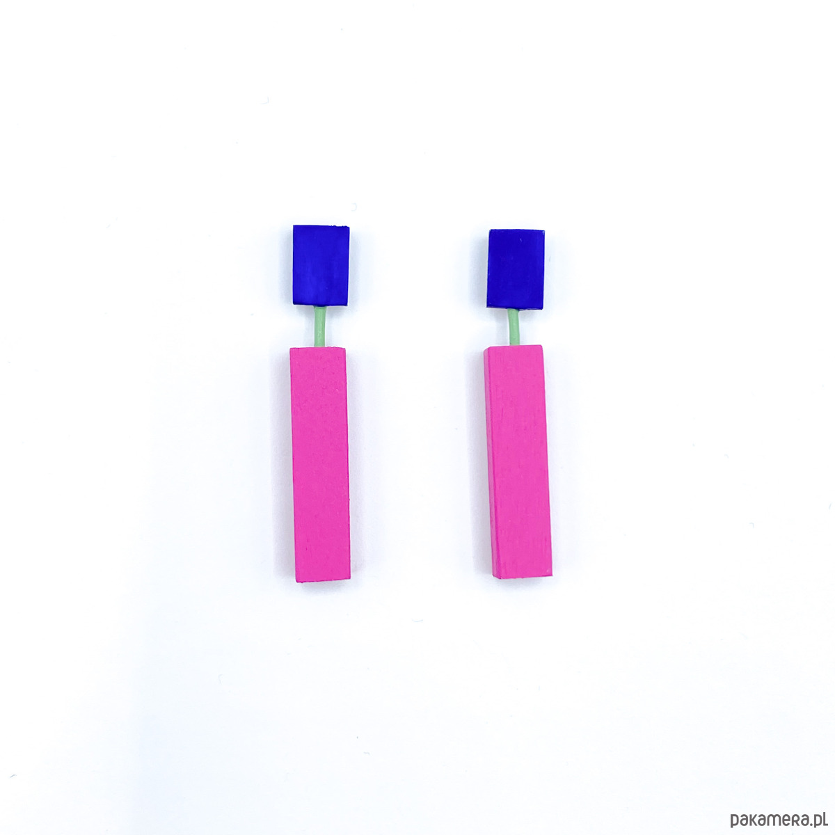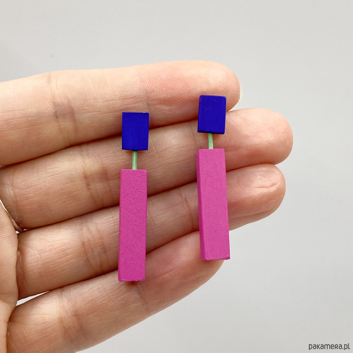 Kolczyki wiszące, na sztyftach ze stali chirurgicznej, wykonane ręcznie z drewna brzozowego. Dodatkiem jest woskowany rzemień. Kolczyki zostały pokryte farbą akrylową oraz matowym, wodnym lakierem.