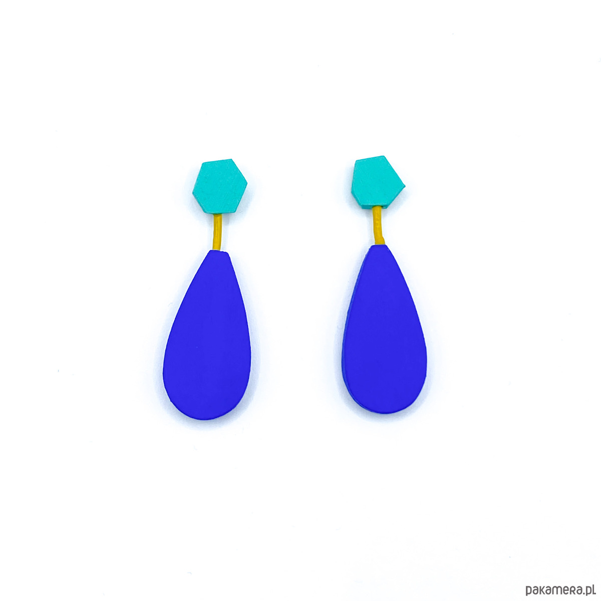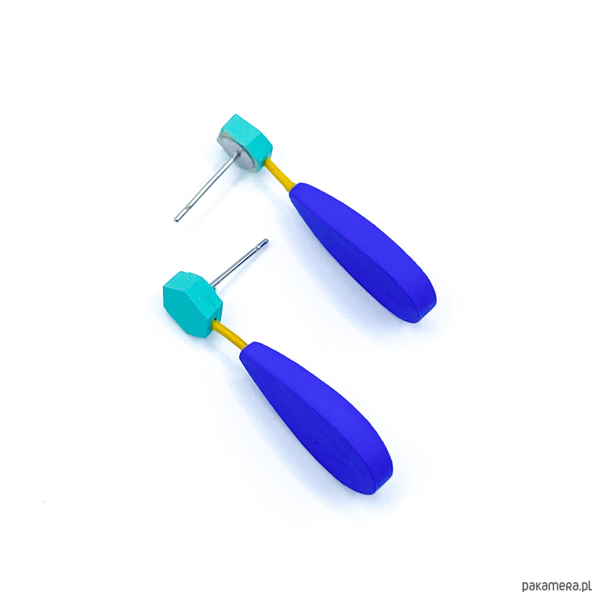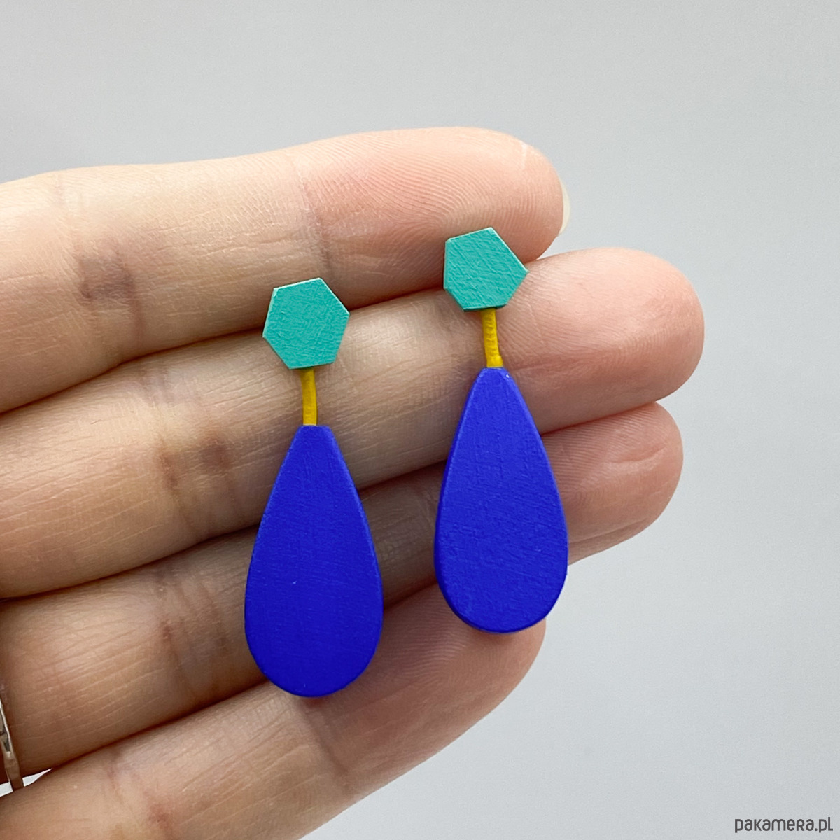 Kolczyki wiszące, na sztyftach ze stali chirurgicznej, wykonane ręcznie z drewna brzozowego. Dodatkiem jest woskowany rzemień. Kolczyki zostały pokryte farbą akrylową oraz matowym, wodnym lakierem.