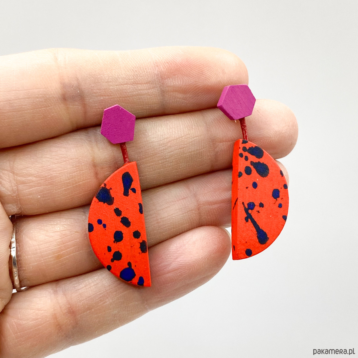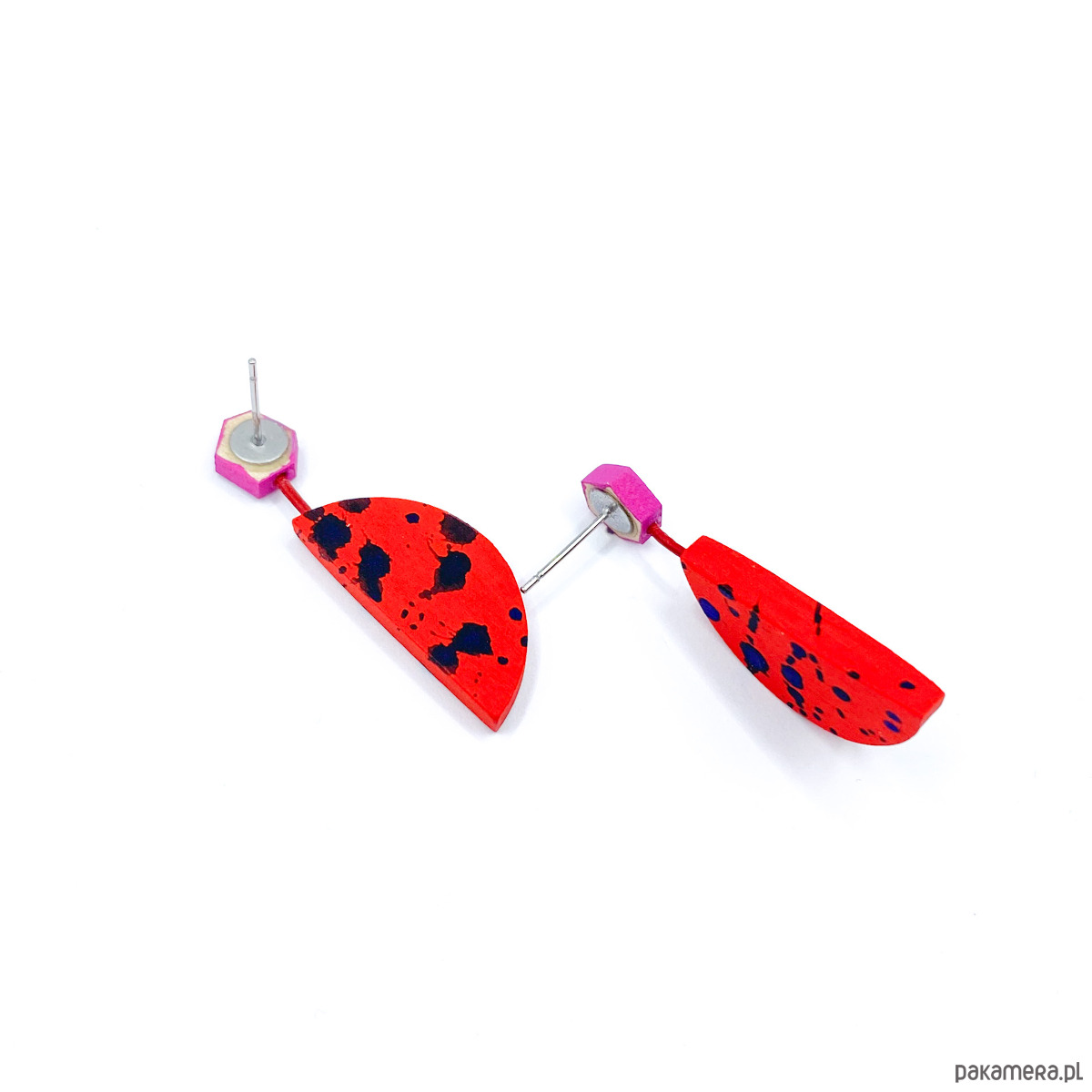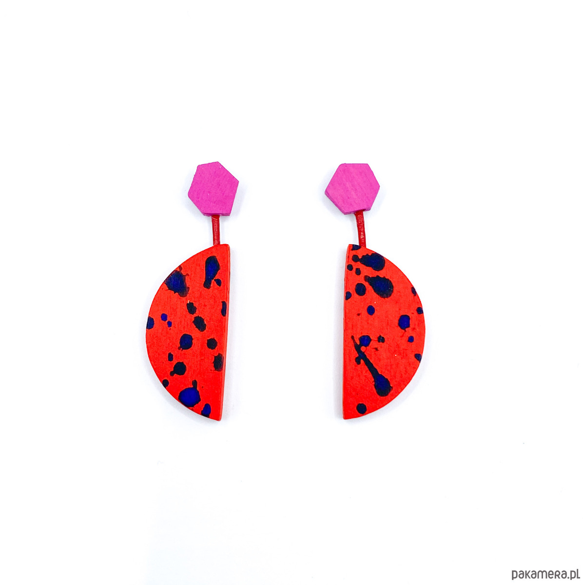 Kolczyki wiszące, na sztyftach ze stali chirurgicznej, wykonane ręcznie z drewna brzozowego. Dodatkiem jest woskowany rzemień. Kolczyki zostały pokryte farbą akrylową oraz matowym, wodnym lakierem.