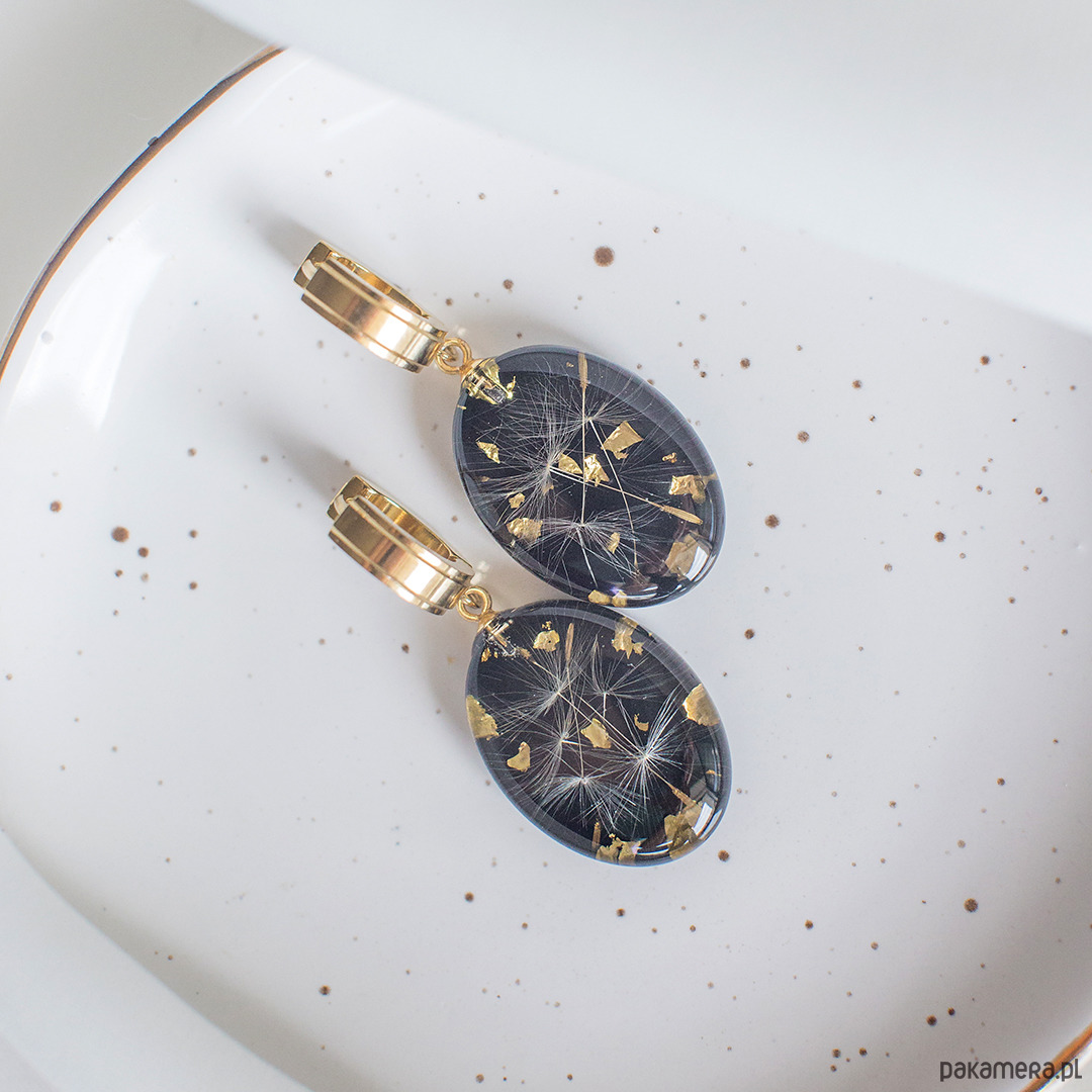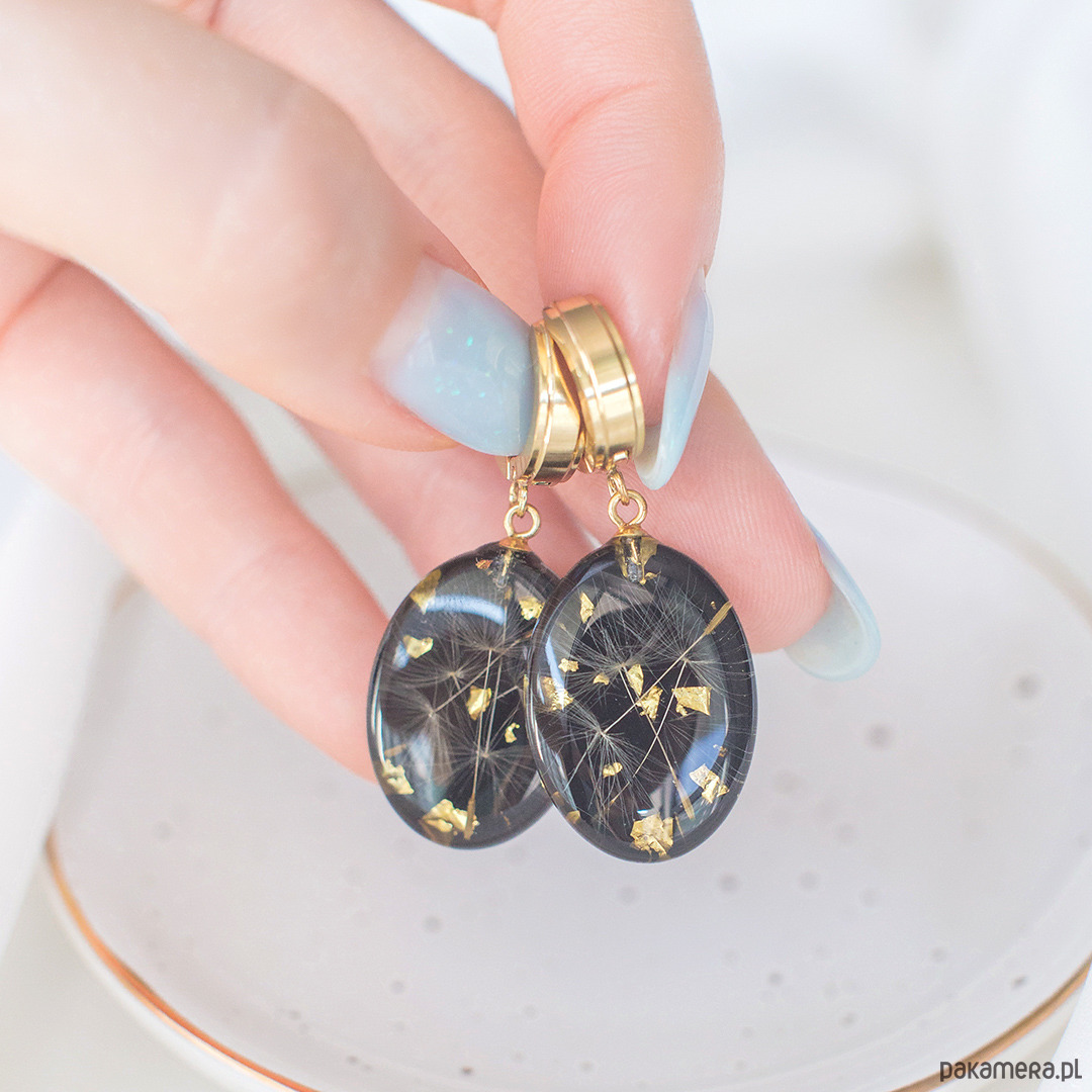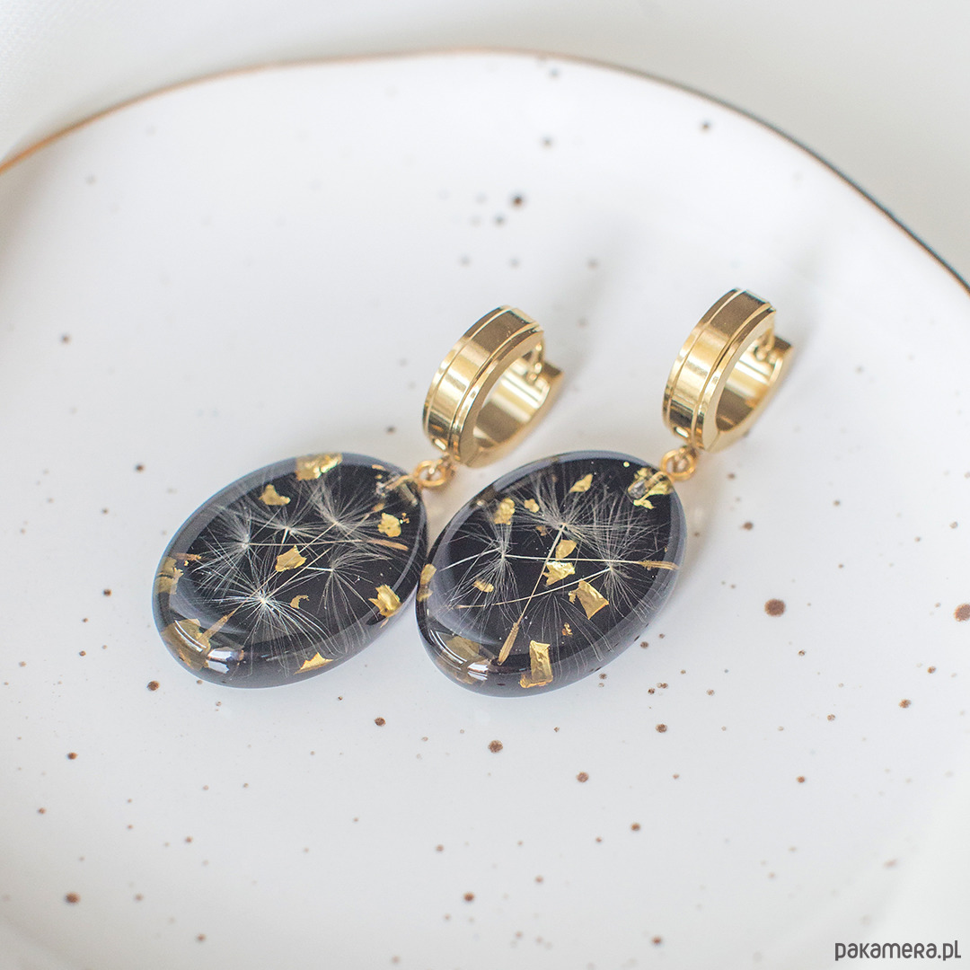 Kolczyki wykonany jest z żywicy epoksydowej z wykorzystaniem suszonych kwiatów. Metalowe elementy to stal nierdzewna szlachetna chirurgiczna.