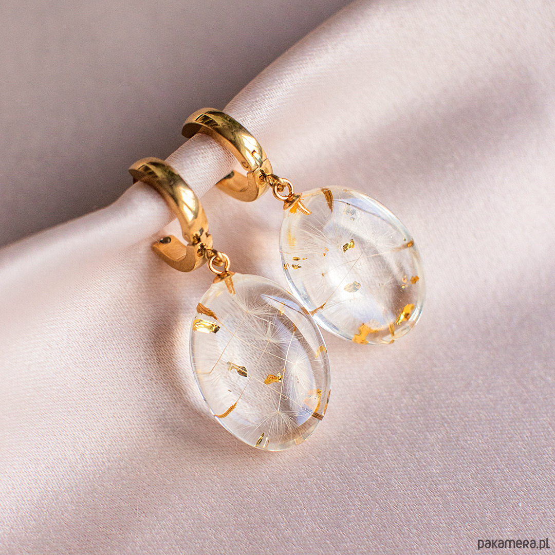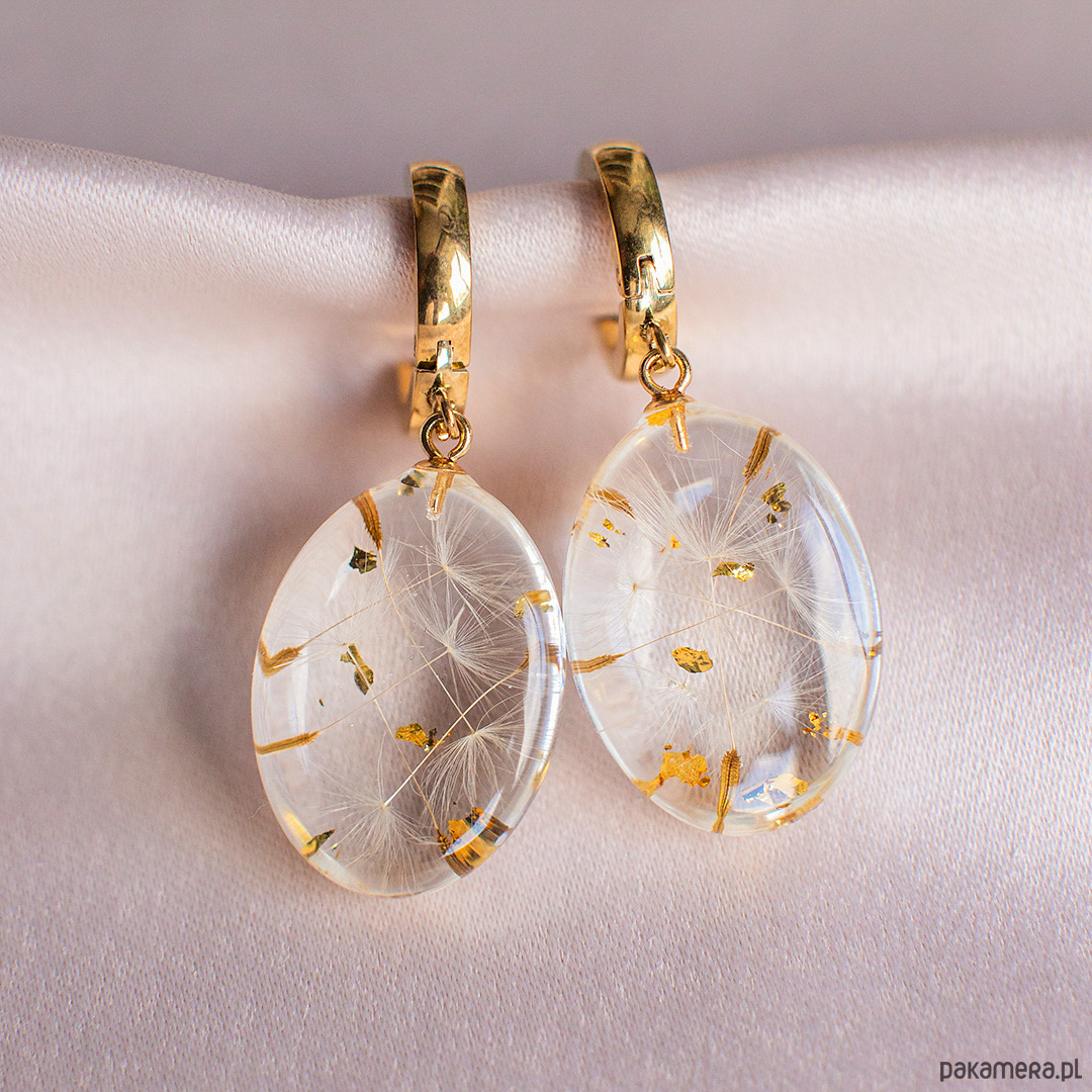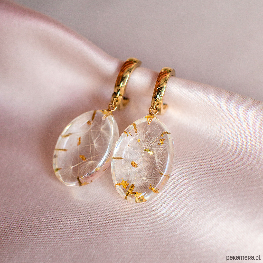 Kolczyki wykonany jest z żywicy epoksydowej z wykorzystaniem suszonych kwiatów. Metalowe elementy to stal nierdzewna szlachetna chirurgiczna.