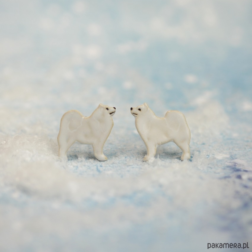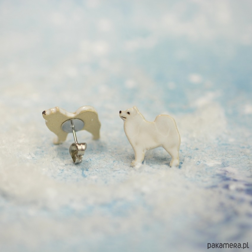 Malutkie samojedy mają rozmiary: 1,5cm wysokość, 1,4cm szerokość, 1,5mm grubość. Kolczyki wykonuję od podstaw ręcznie:) Każda para jest inna:)))) Samojedy zostały solidnie umocowane na sztyftach ze stali chirurgicznej- antyalergiczna w kolorze oksydowanego srebra. Wysyłam w ozdobnym pudełeczku.