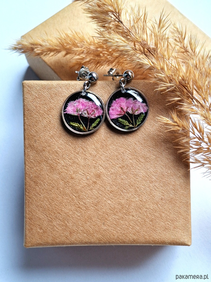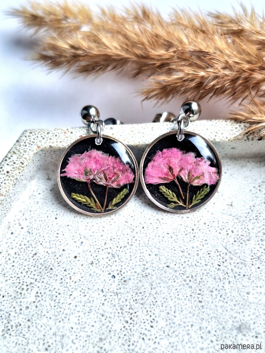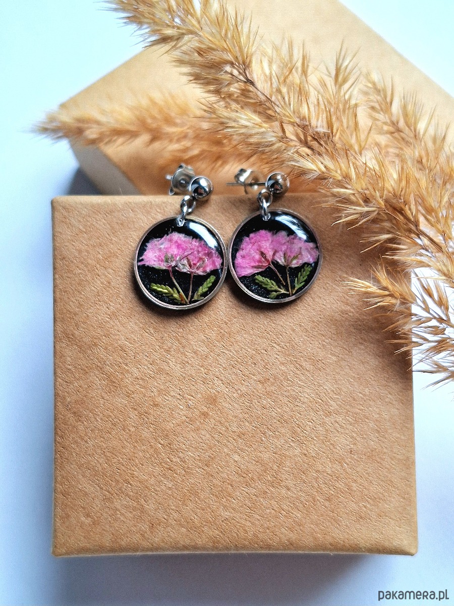 Kolczyki z suszonymi kwiatami różowej gipsówki na czarnym tle srebrne