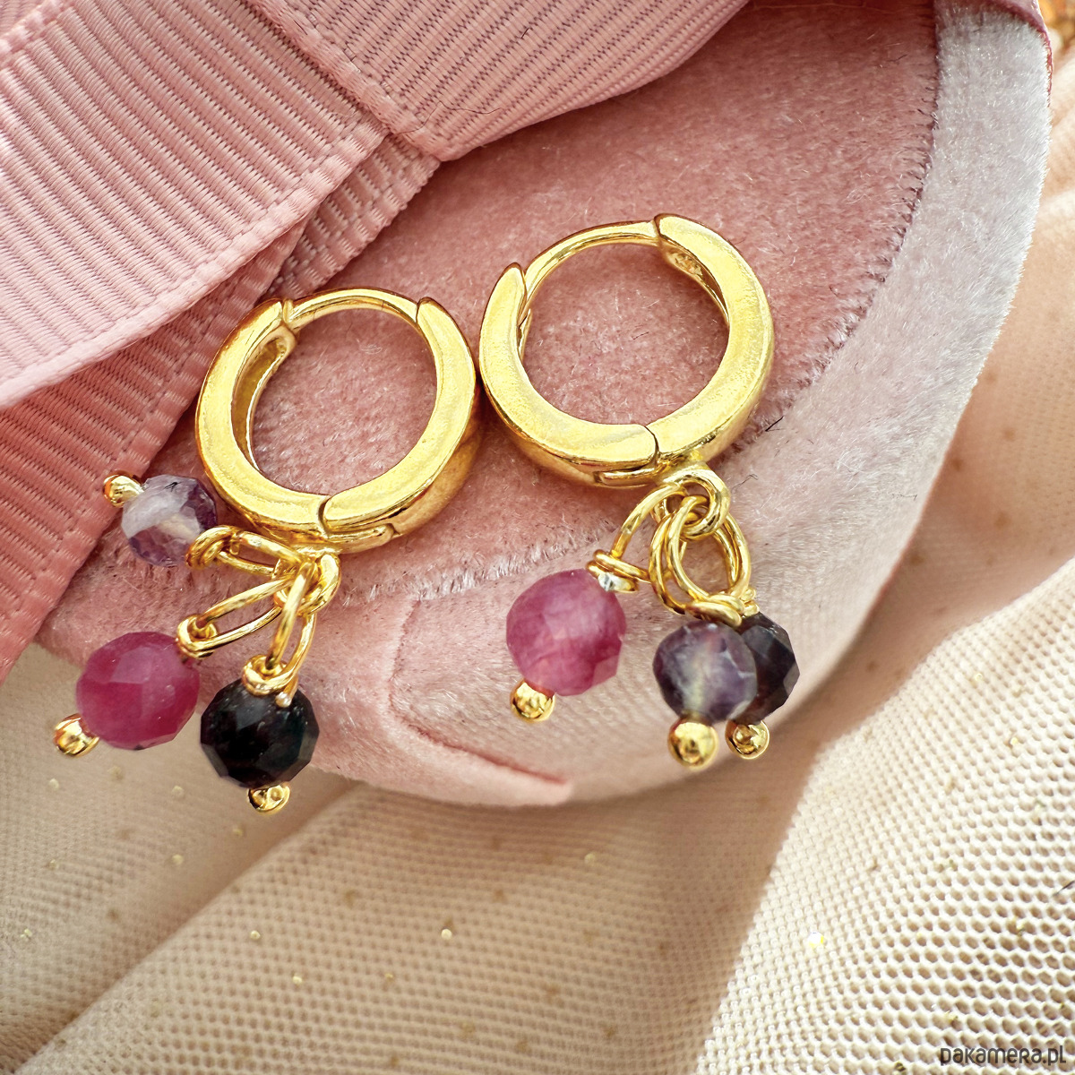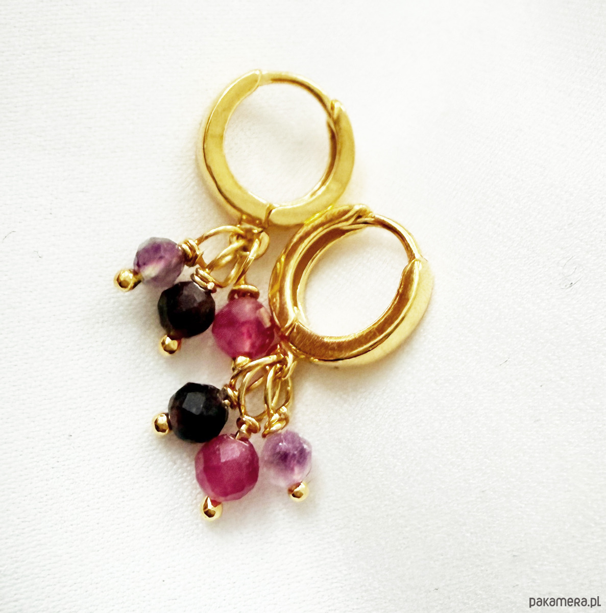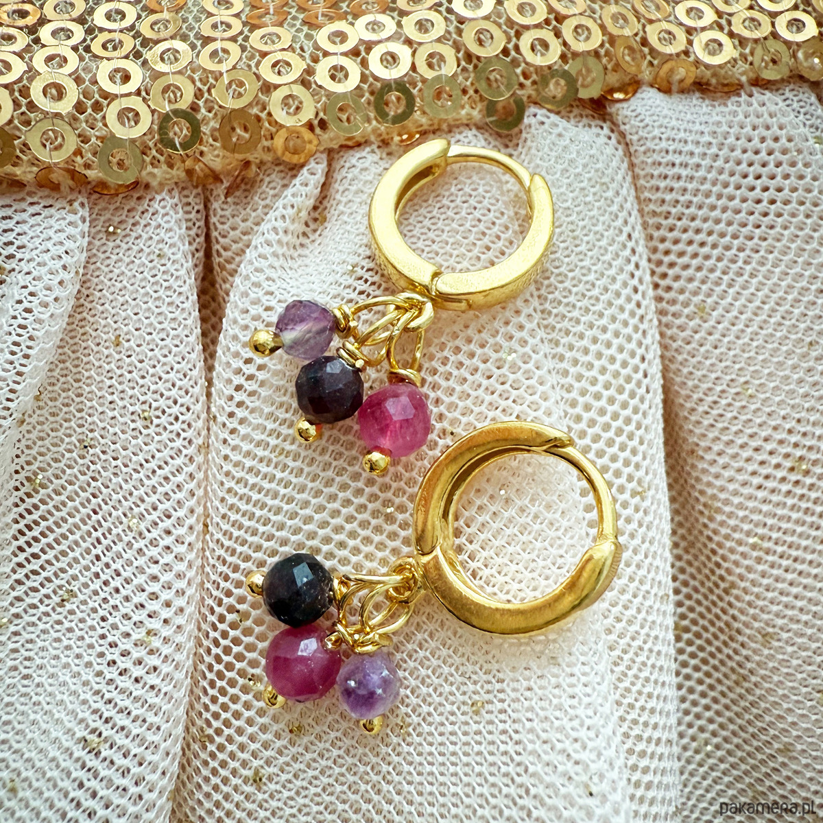 Piękne, ręcznie wykonane kolczyki ze srebra 925, złocone 24-karatowym złotem, łączą elegancję z subtelnym blaskiem. Każda para ma trzy delikatne zawieszki z fasetowanych, naturalnych kamieni, oplecionych drutem z czystego złoconego srebra. Fasetowanie nadaje kamieniom wyjątkowy połysk i efekt ukośnie ściętych krawędzi.