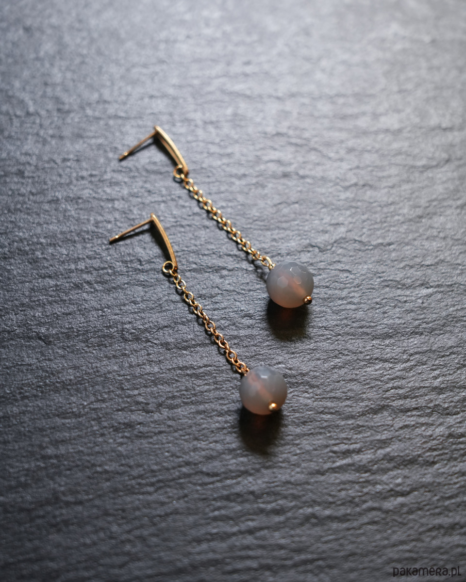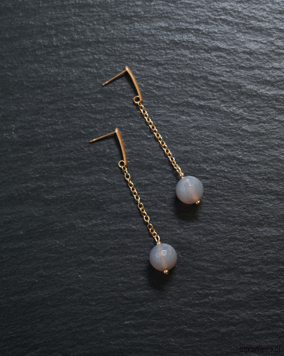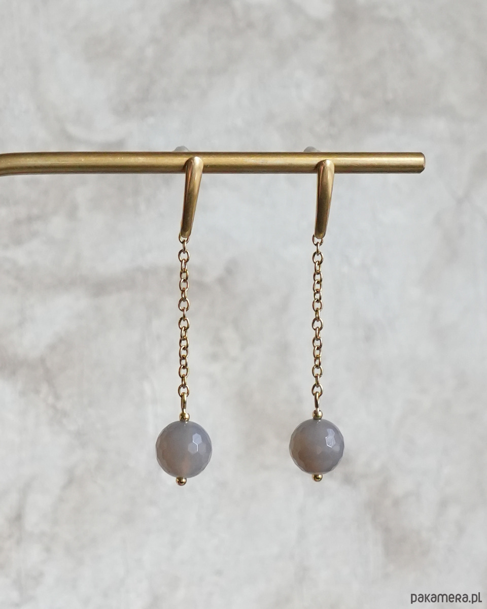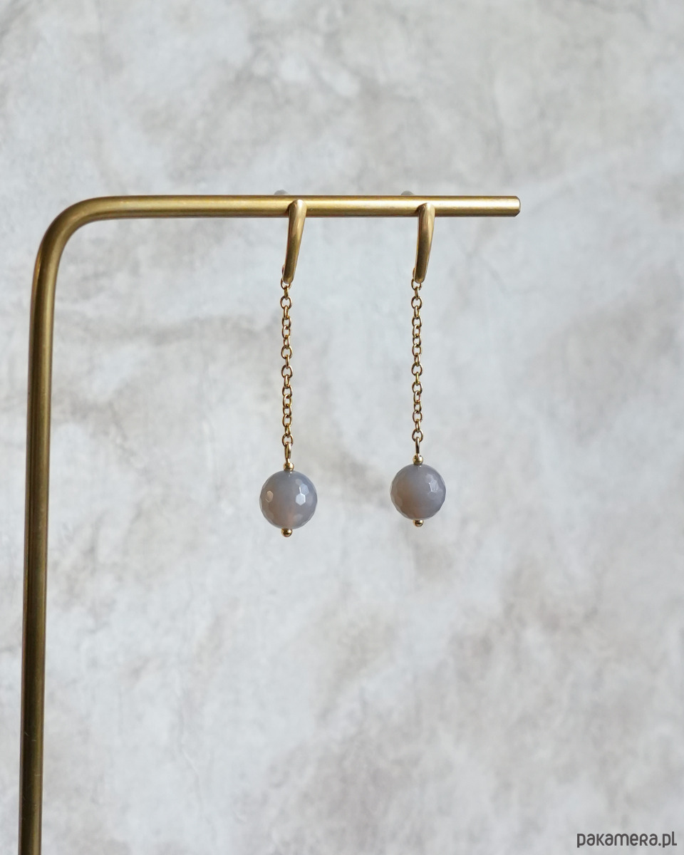 Minimalistyczne, wiszące kolczyki z dużymi, fasetowanymi kulkami z szarego AGATU, zawieszonymi na złotym łańcuszku ze STALI SZLACHETNEJ. Całość zwieńczają ozdobne, podłużne sztyfty, również ze STALI SZLACHETNEJ. Świetna opcja na wieczorne wyjście, ale i do noszenia na co dzień.