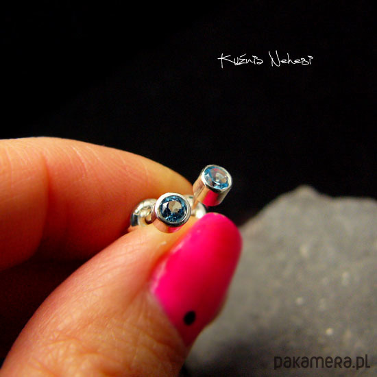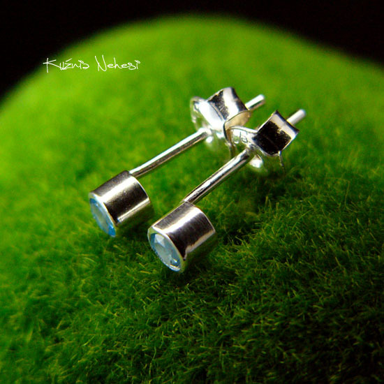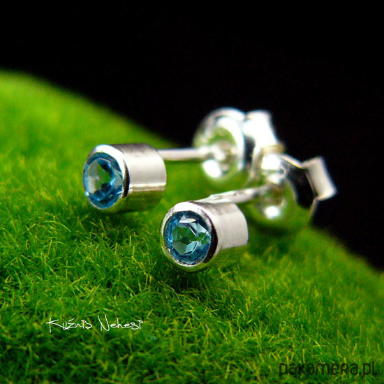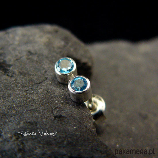 Kolczyki sztyfty dla Pań lubiących delikatną biżuterię, kropeczki z naturalnymi błekitnymi Topazami Swiss Blue, oprawione w srebro próby 925. Całość wykonana ręcznie. Średnica kolczyka - to tylko 4,2 milimetra. Urocze delikatne maleństwa do noszenia na co dzień. Polecam :)