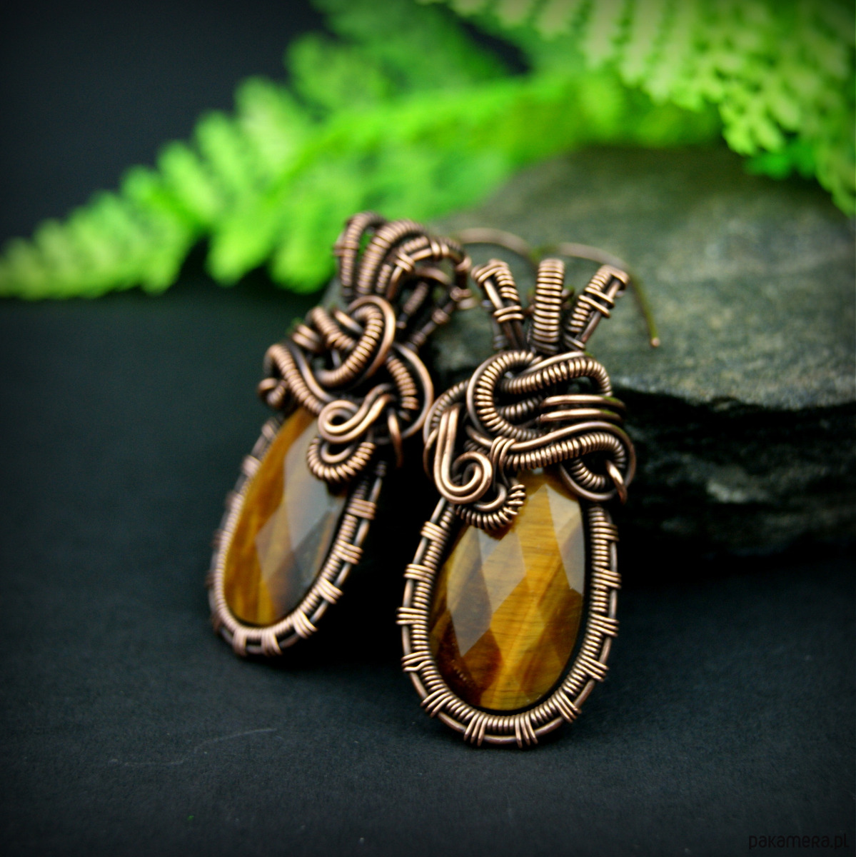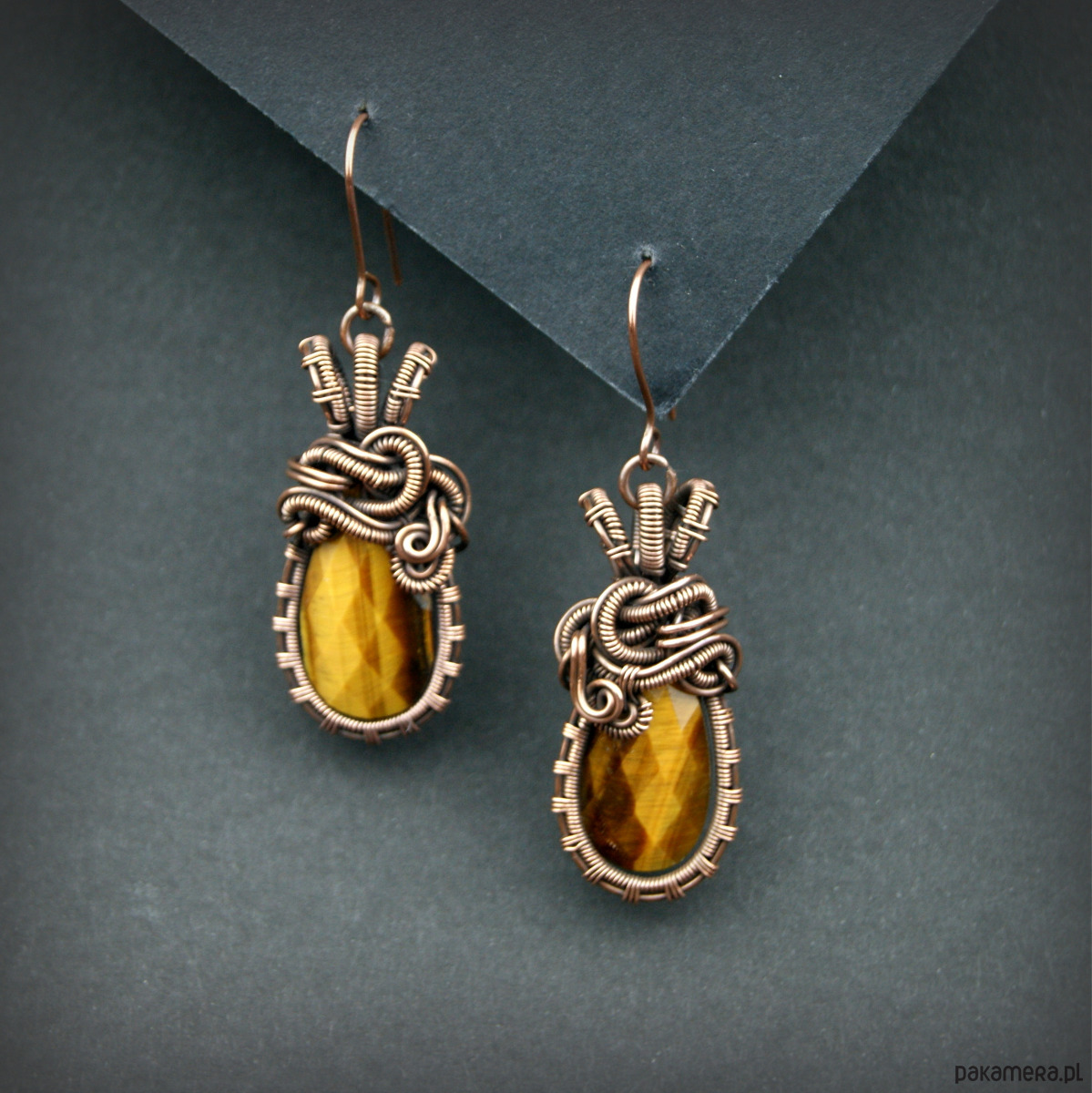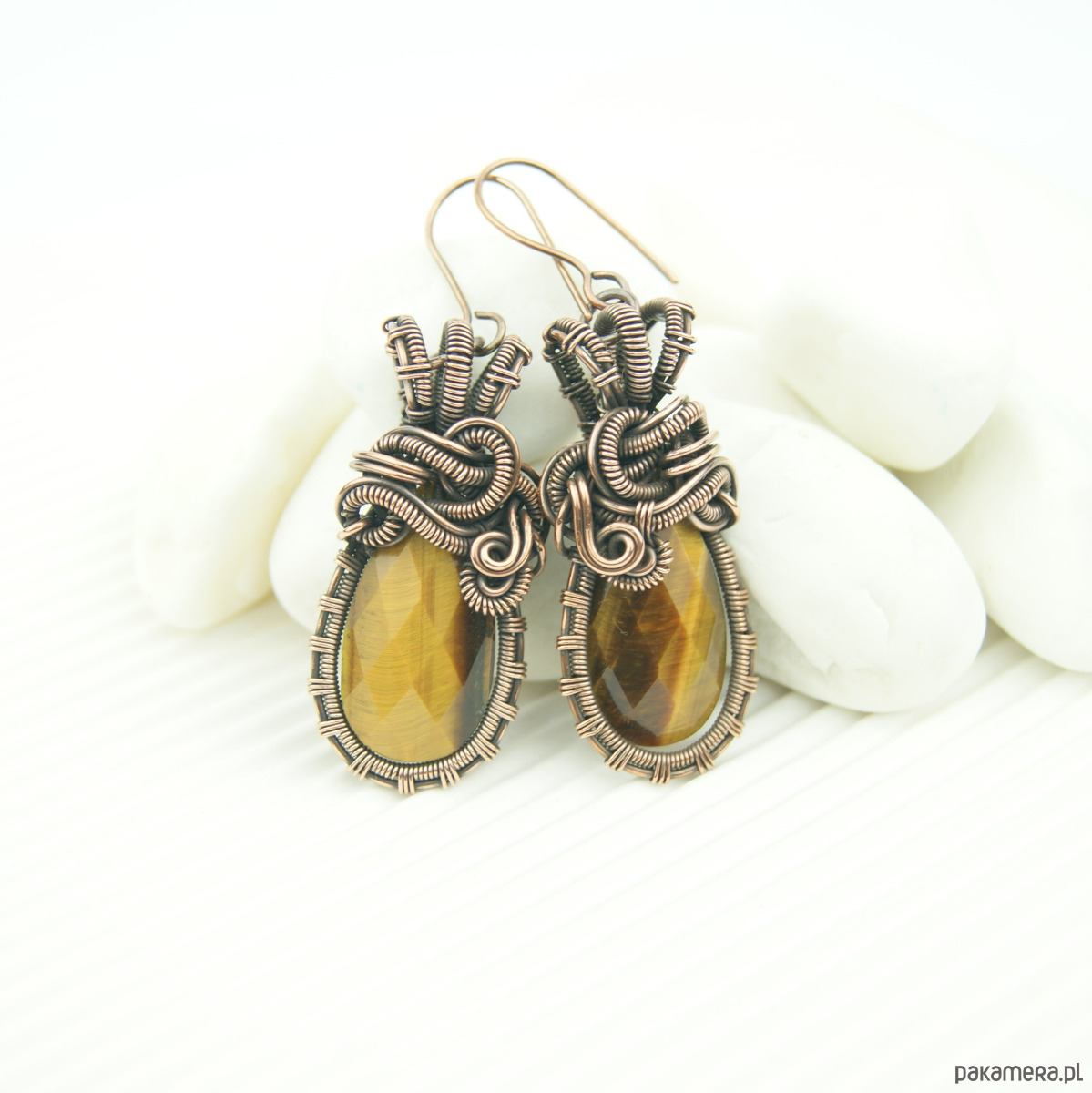Wiszące kolczyki w całości wykonane z miedzi. Podstawę kolczyków są fasetowane kamienie tygrysiego oka, całość misternie opleciona miedzią. Biżuteria oksydowana.