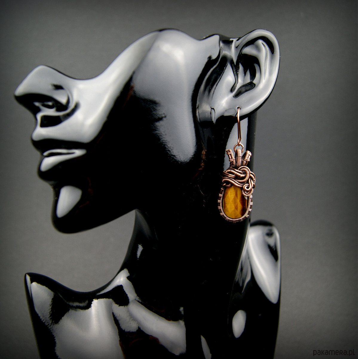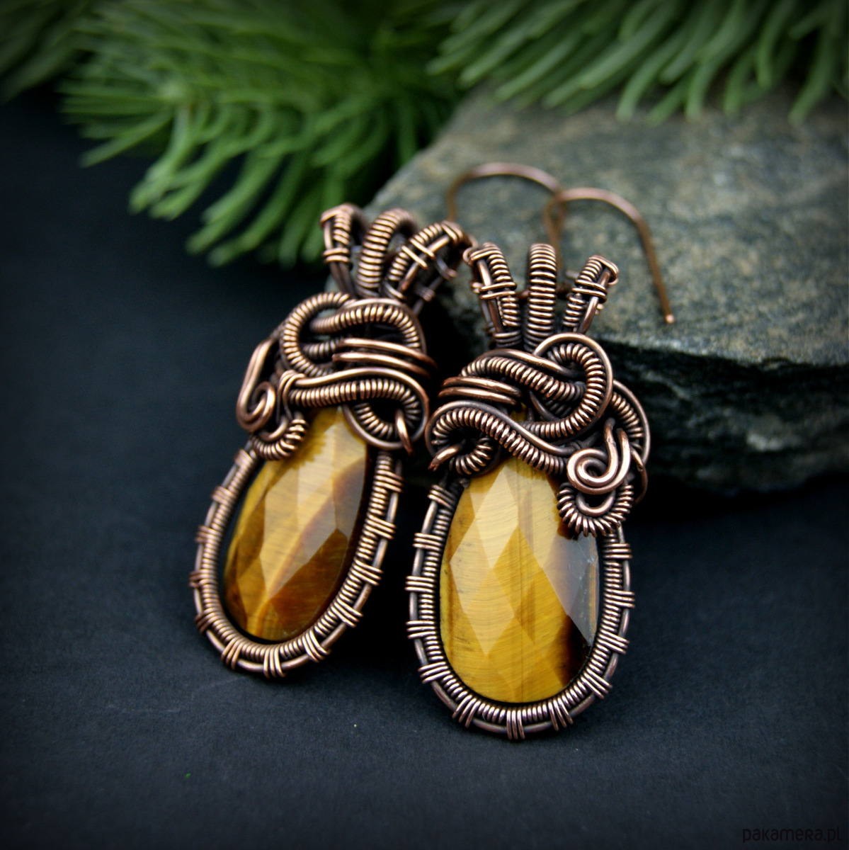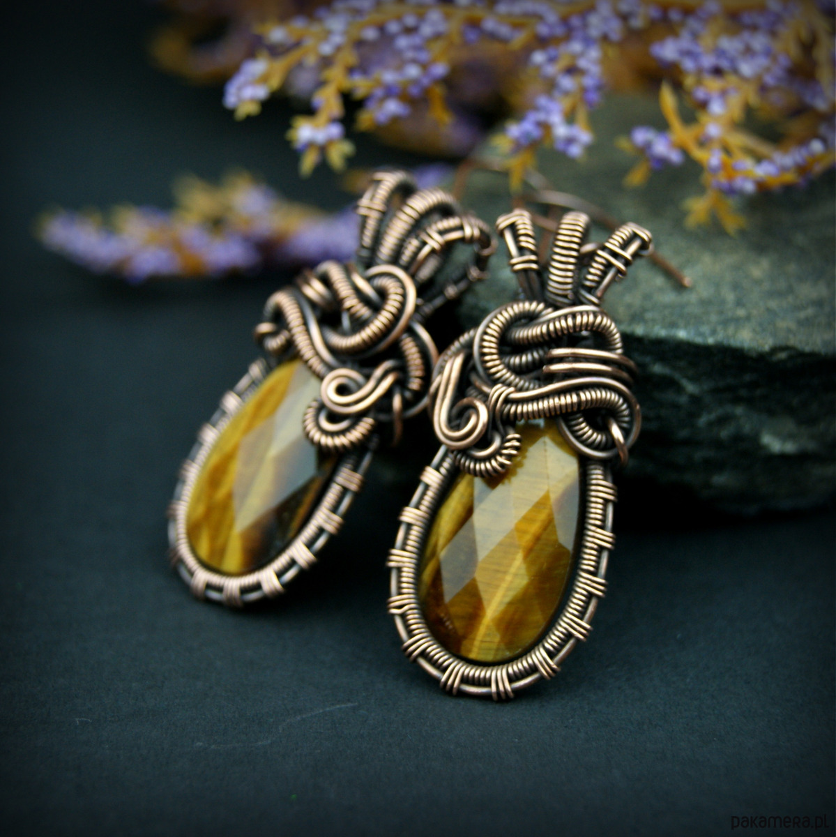 Wiszące kolczyki w całości wykonane z miedzi. Podstawę kolczyków są fasetowane kamienie tygrysiego oka, całość misternie opleciona miedzią. Biżuteria oksydowana.