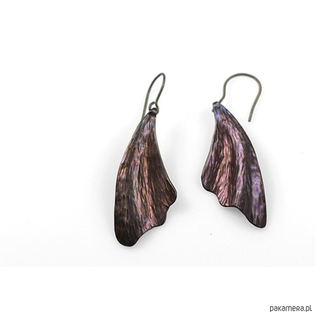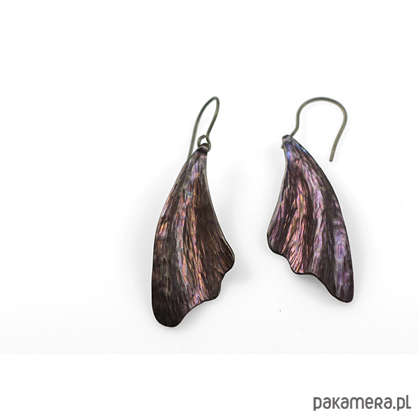 Kolczyki w kształcie liści w całości zrobiłem ręcznie z tytanu.Są lekkie, efektowne i mienią się kolorami.Są wielkości 2,3 cm i długości 4,3 cm.W całości kolczyki są długości ok.6,5 cm. Zawieszka z tytanu .Na odwrocie sygnowane wygrawerowanym podpisem.Tytan jest niezwykle lekkim i trwałym metalem który nie wywołuje żadnych alergii-jest hipoalergiczny-stosowany w