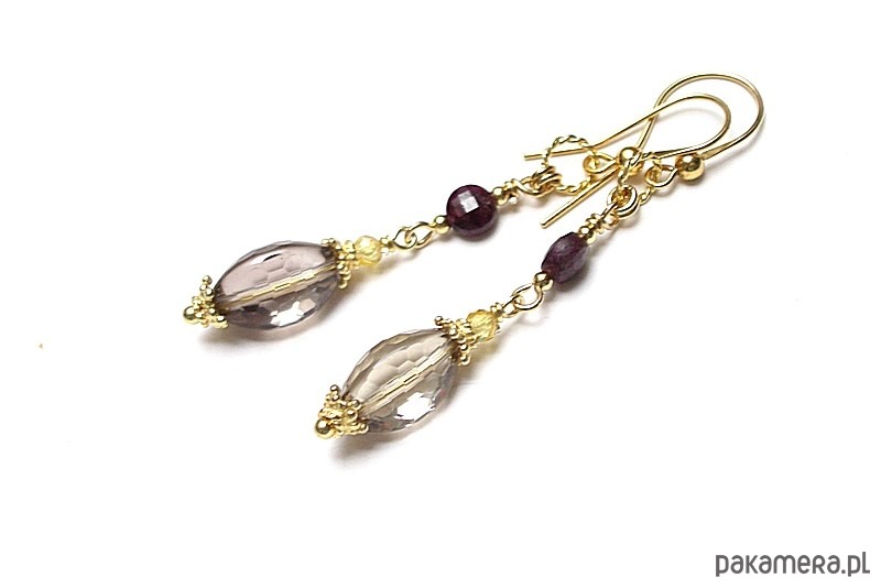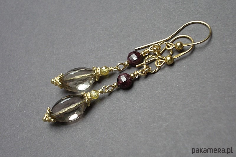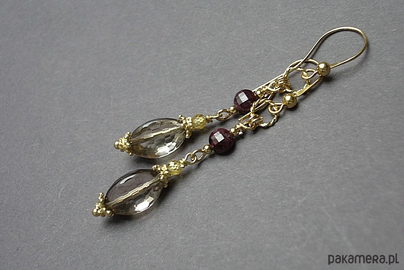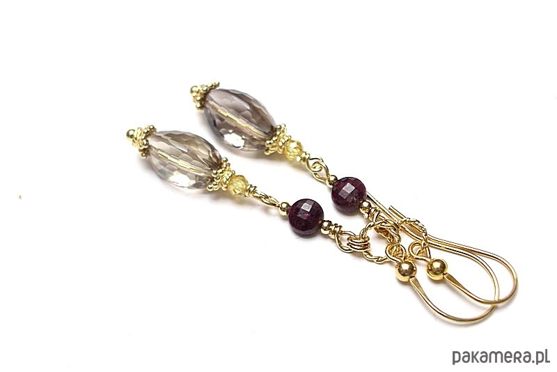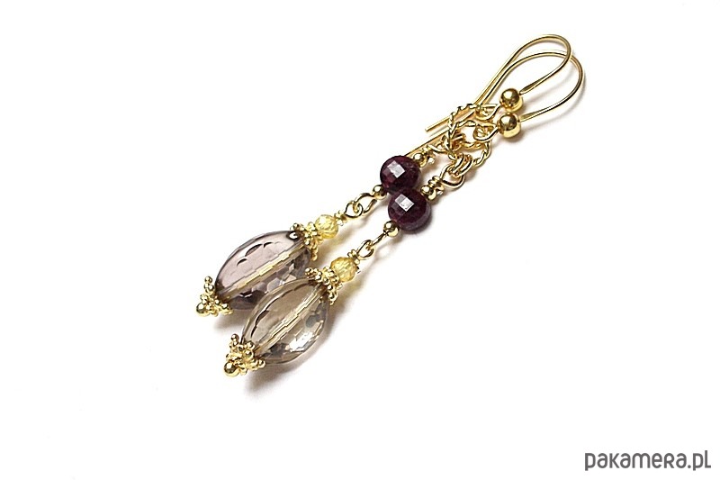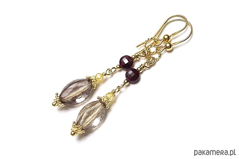 Kolczyki wykonane ze srebra pokrytego 24k złotem [pr. 925] w połączeniu z wysokiej jakości oliwkami kwarców dymnych [12mm], fasetowanymi pasylkami granatów [6mm] oraz cyrkoniami [3mm] .Całkowita długość kolczyków 6,2cm.
