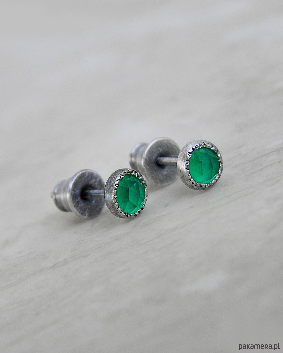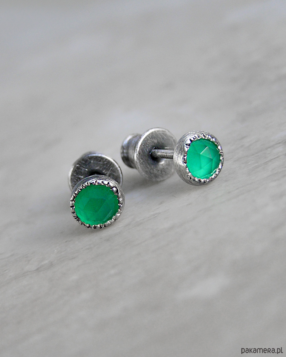 Unikatowe maleńkie kolczyki wykonane ze srebra 925 z fasetowanymi zielonymi agatami.