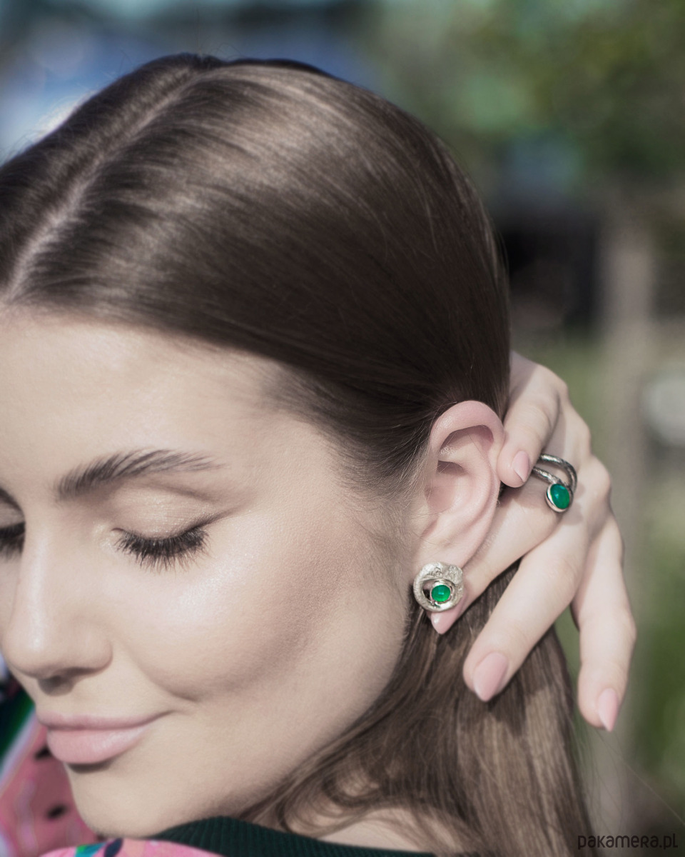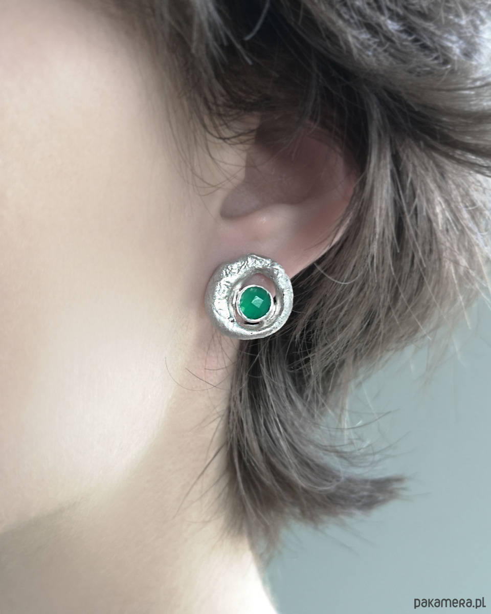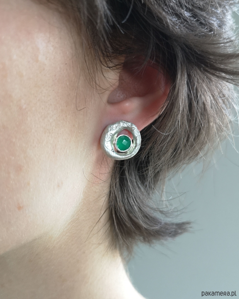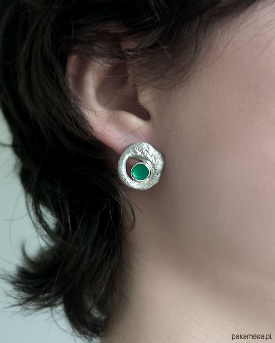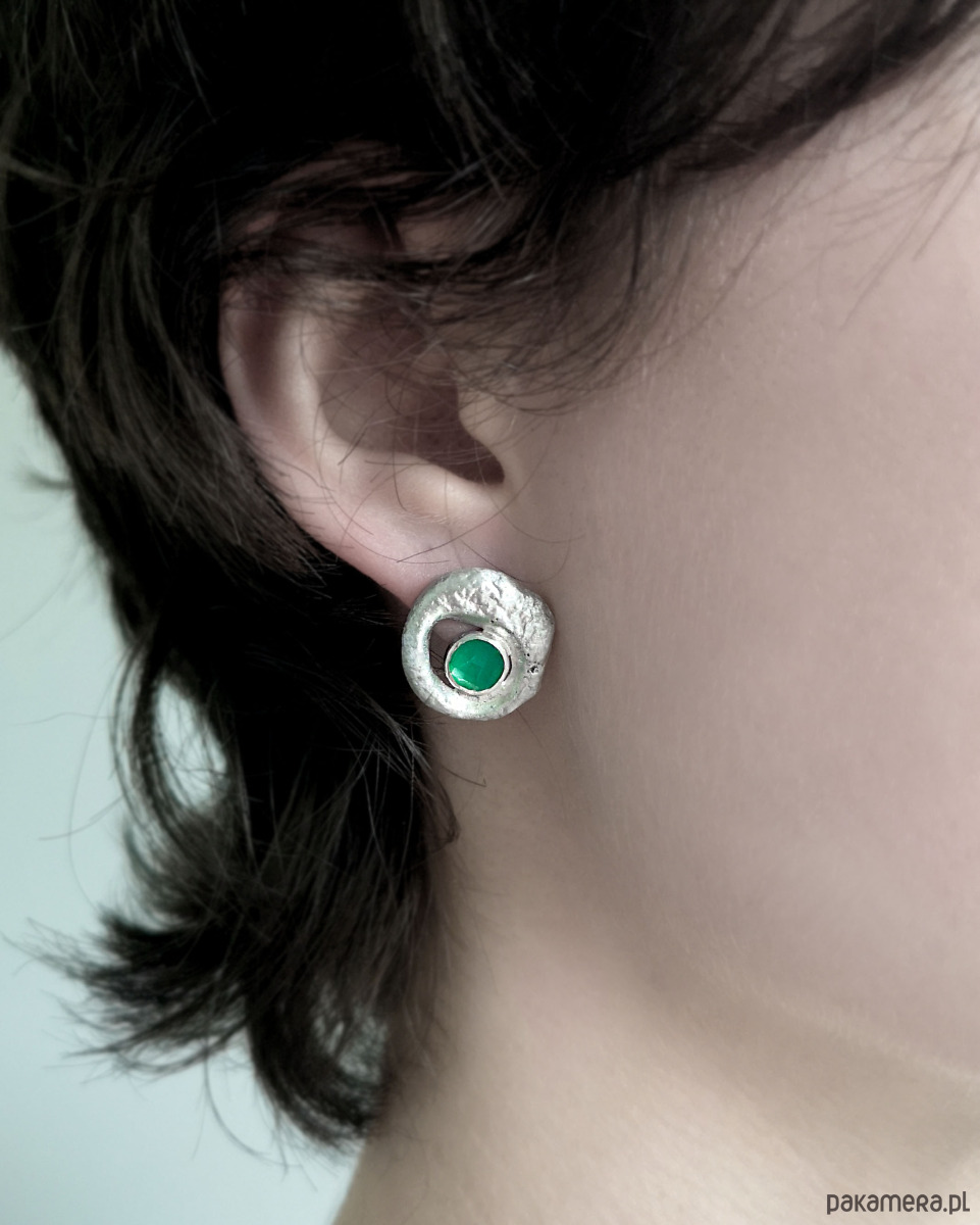 Unikatowe asymetryczne kolczyki wykonane ze srebra próby 925 z zielonym agatem.