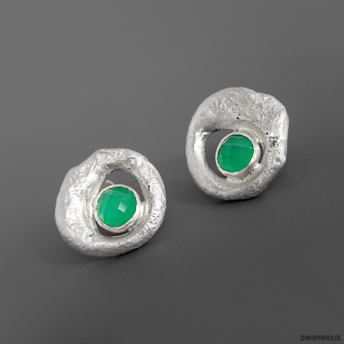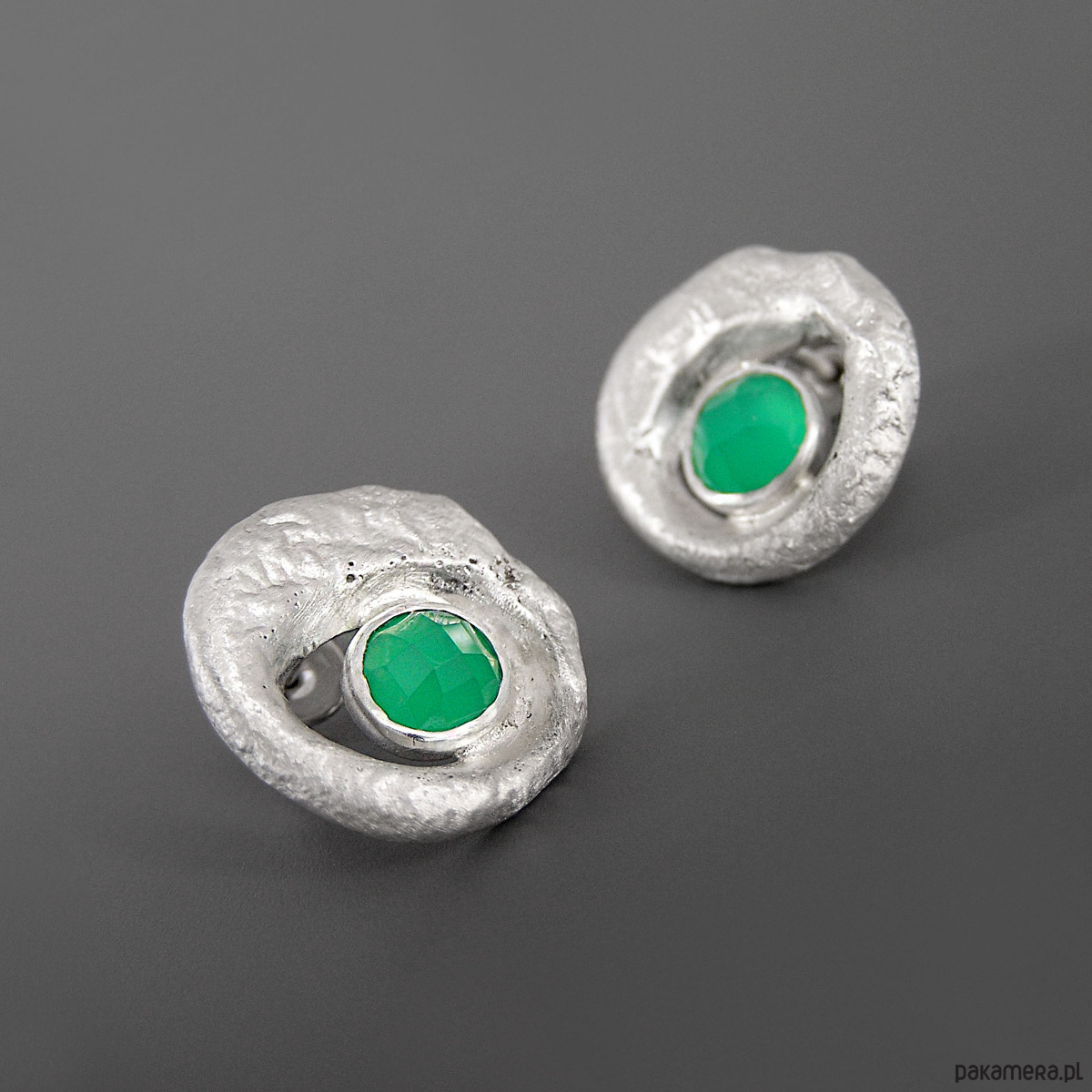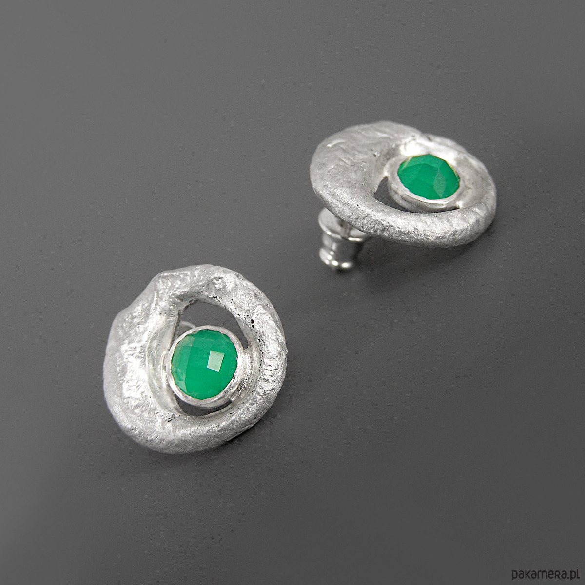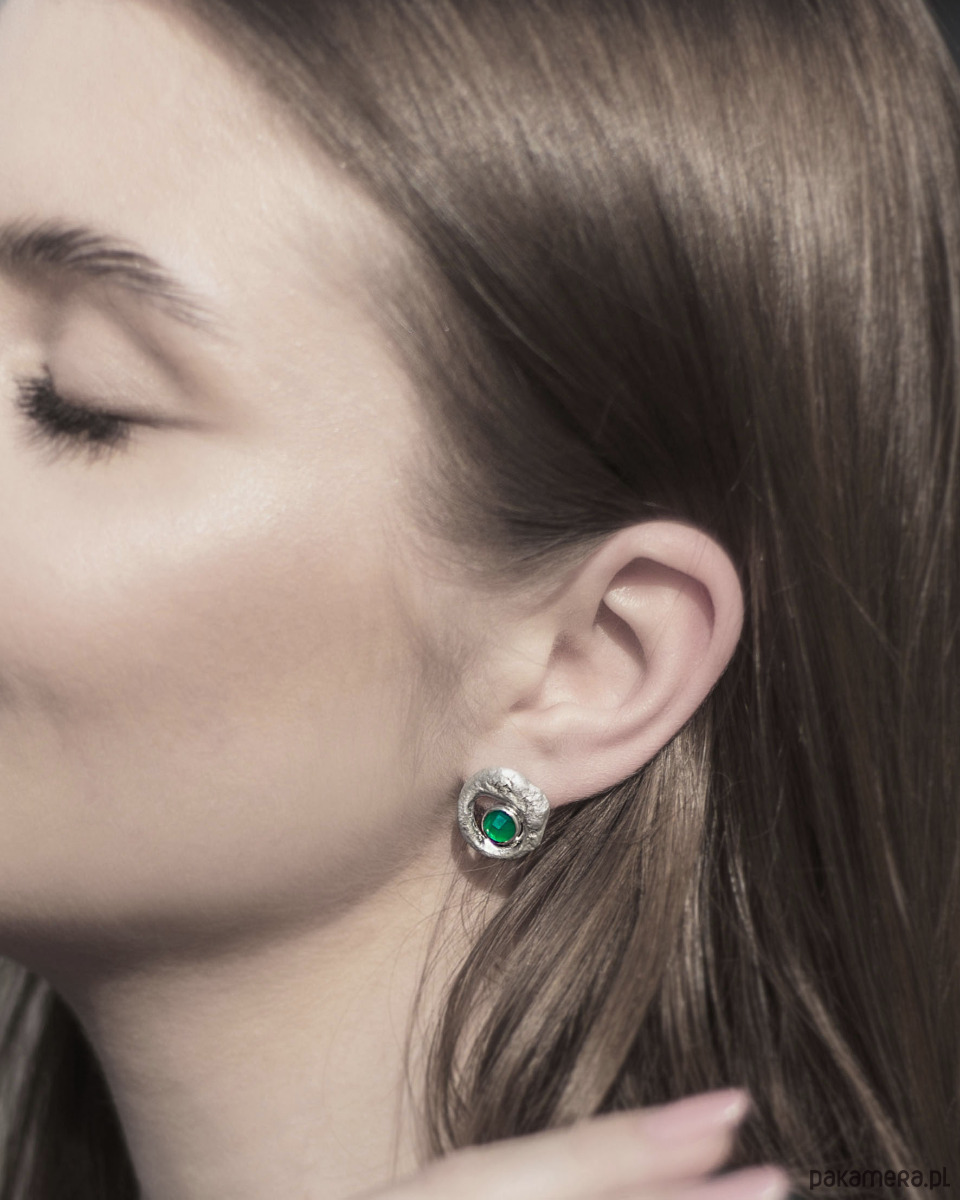 Unikatowe asymetryczne kolczyki wykonane ze srebra próby 925 z zielonym agatem.