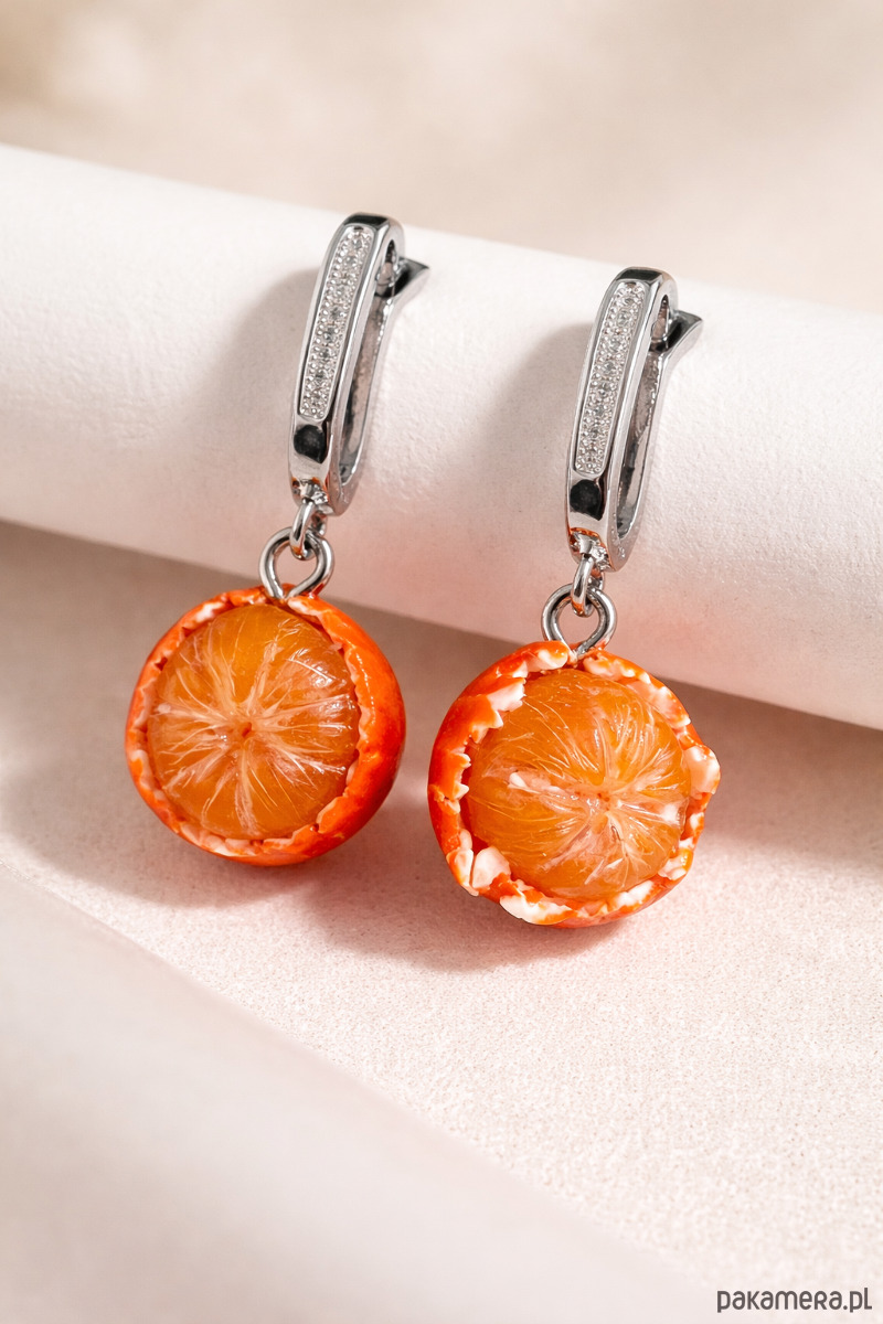 Wyraziste, ręcznie wykonane kolczyki w ciepłym, pomarańczowym odcieniu.
