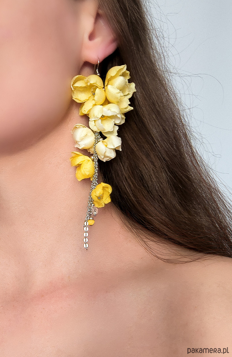 Unikatowe kolczyki z jedwabnymi kwiatami w różnych odcieniach żółtego.