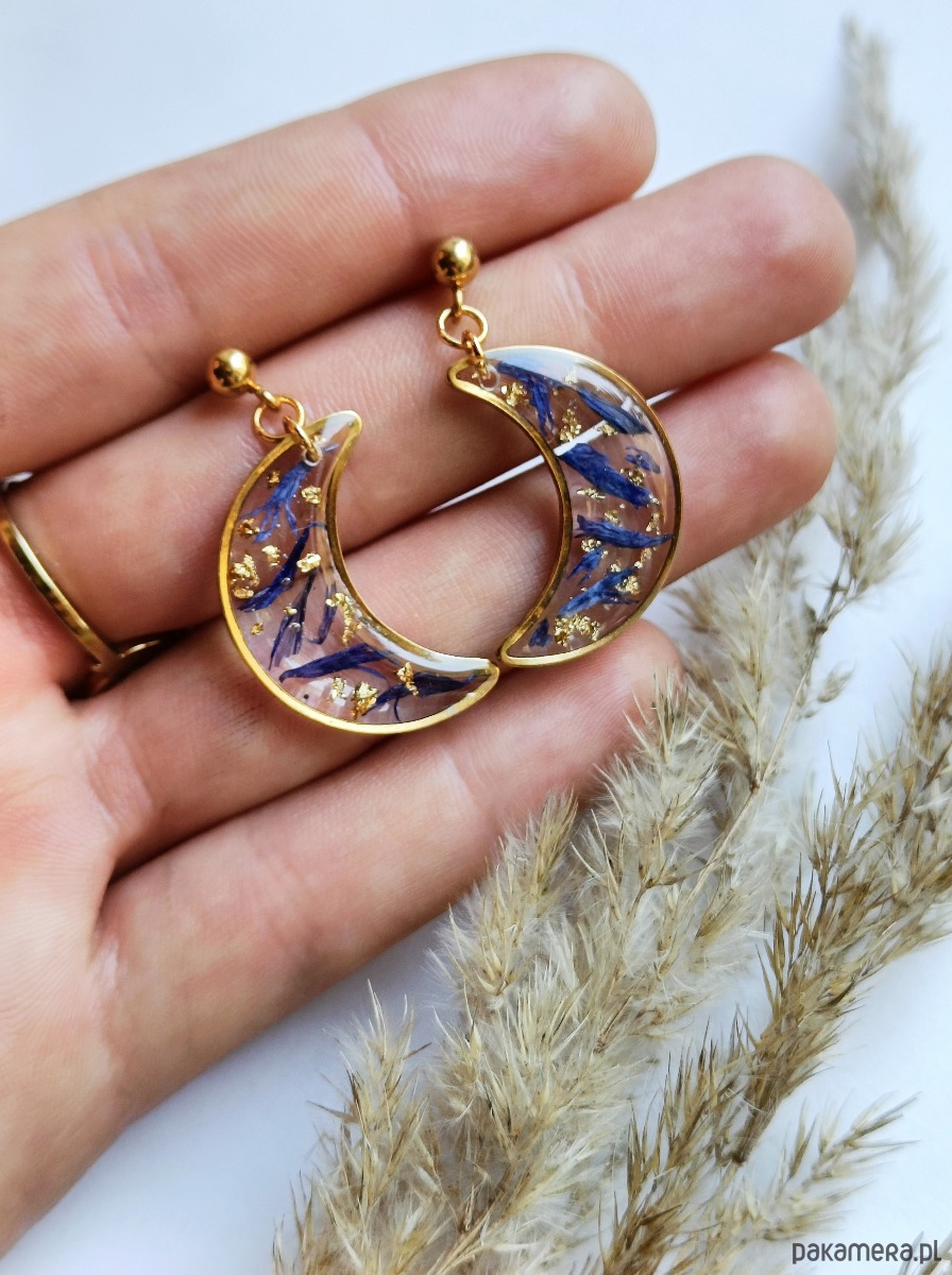 Urocze kolczyki w kształcie księżyca z zatopionymi płatkami chabra i drobinkami złota. Wykonane z wysokiej klasy żywicy, która nie zmienia koloru pod wpływem promieniowania UV oraz wysokiej jakości stali chirurgicznej.
