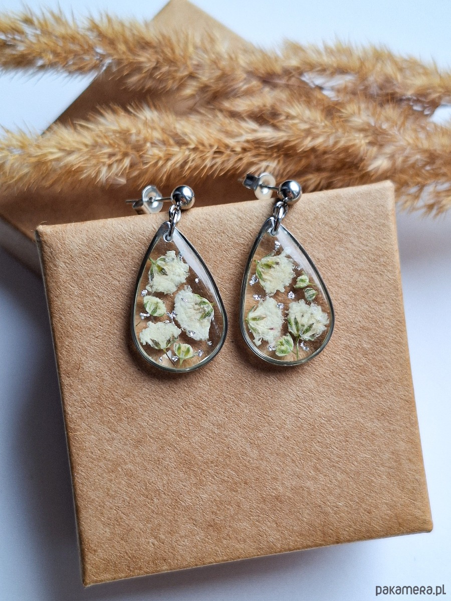 Kolczyki z żywicy łezka srebrne kwiaty białej gipsówki
