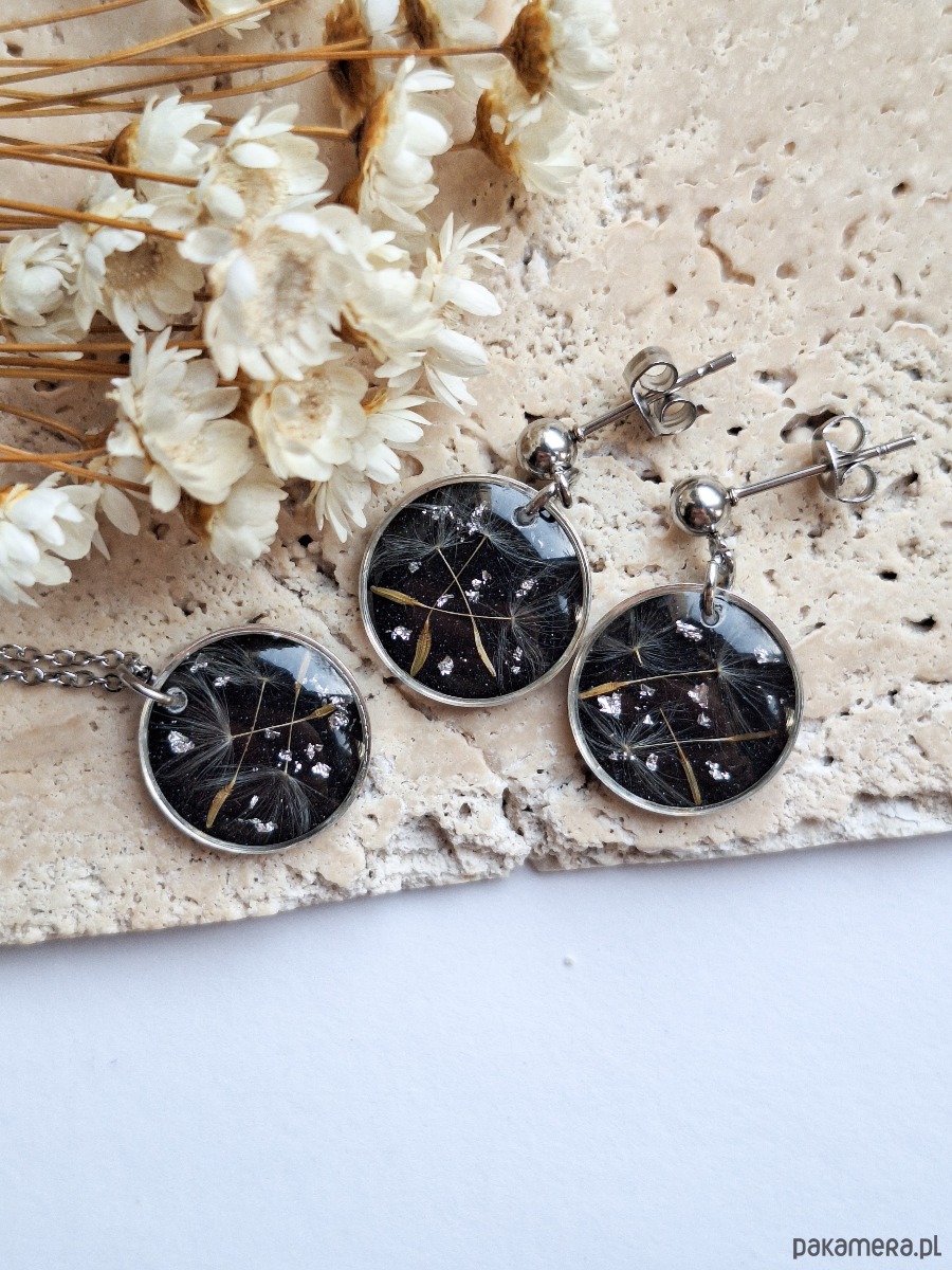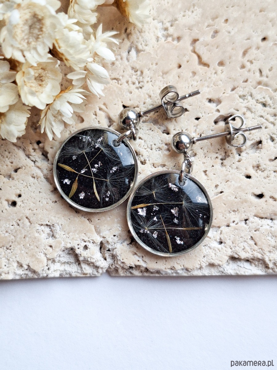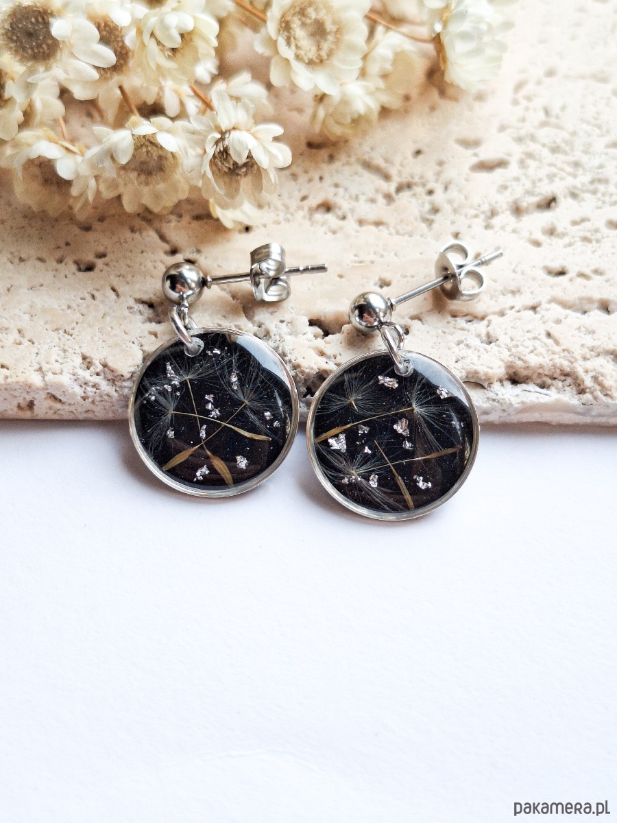 Urocze kolczyki w kształcie kółka z zatopionymi nasionami dmuchawca i płatkami srebra na czarnym, błyszczącym tle. Wykonane z wysokiej klasy żywicy, która nie zmienia koloru pod wpływem promieniowania UV oraz wysokiej jakości stali chirurgicznej.