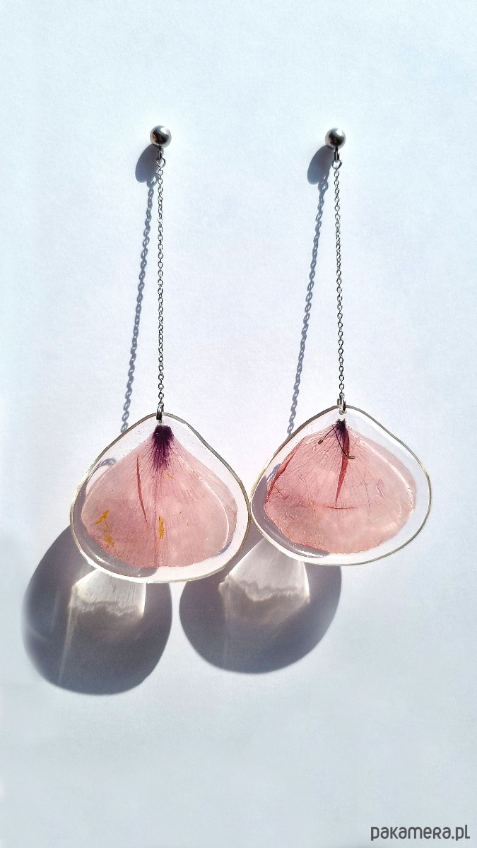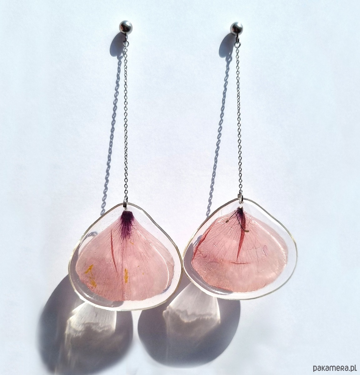 Kolczyki są niezwykle lekkie i wygodne w noszeniu, mimo swojej wyrazistej formy. Każda para jest unikatowa, bo kwiaty w żywicy układają się w niepowtarzalny sposób. To biżuteria dla osób, które cenią rękodzieło i chcą wyróżnić się subtelnym, a jednocześnie efektownym dodatkiem.