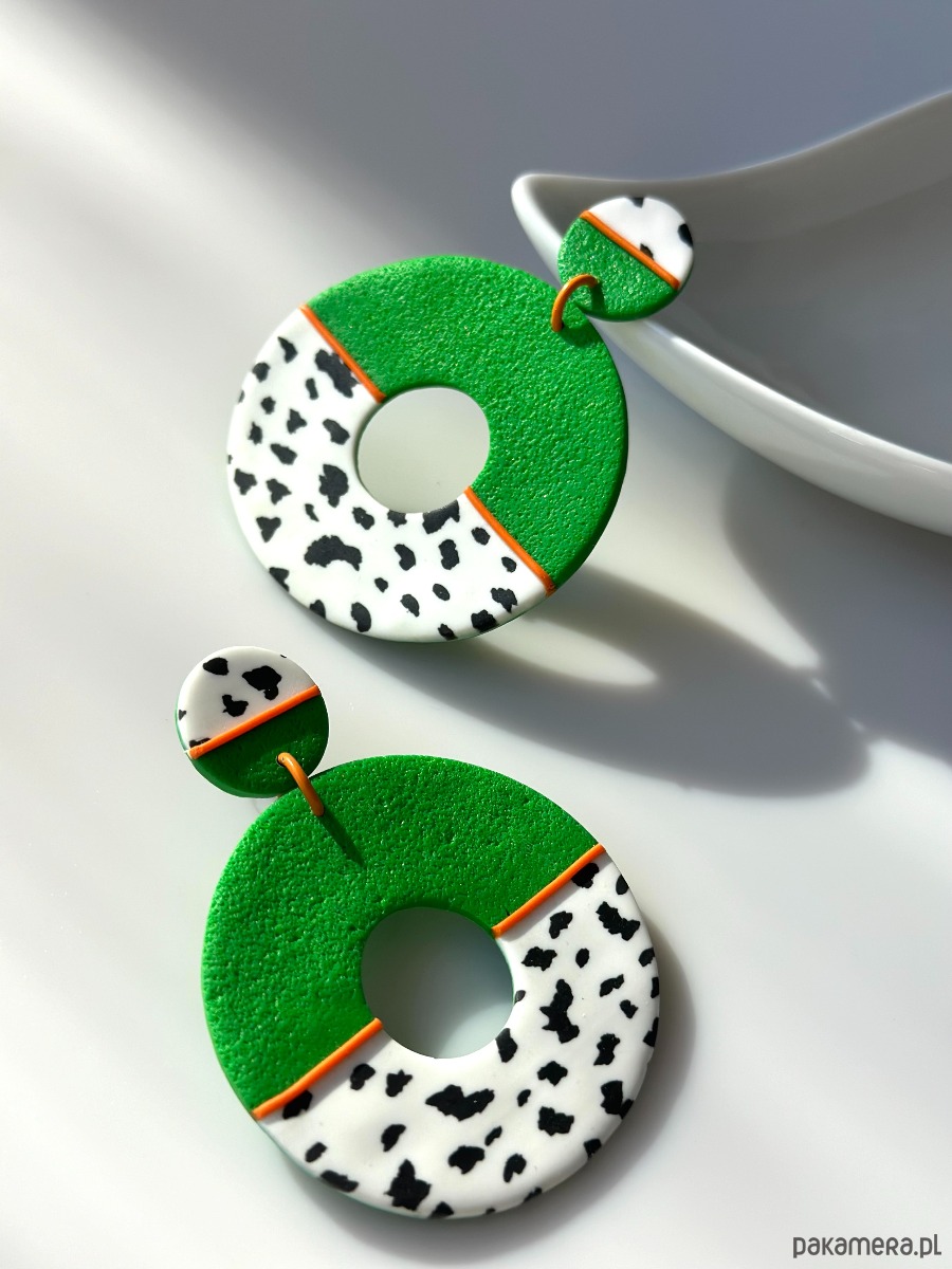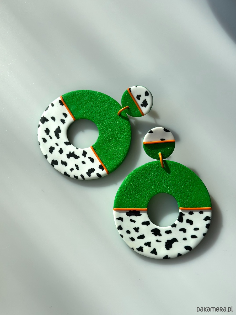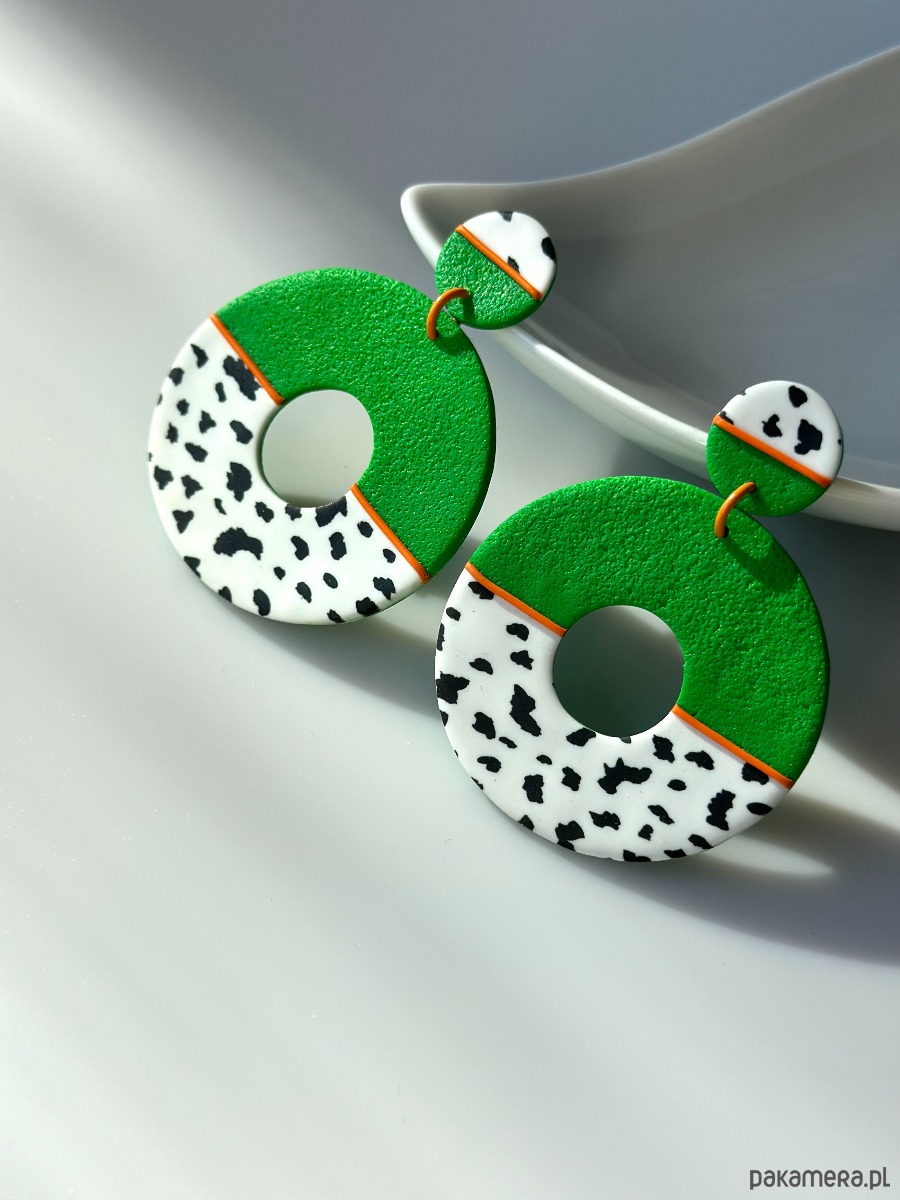 Kolczyki "żabki" to niebanalna propozycja dla wszystkich pań, które odważnie stąpają przez życie. Intsensywna zieleń w połączeniu ze wzorem zwierzęcym (krówkowym) przełamana jest intensywnym pomarańczowym paskiem.