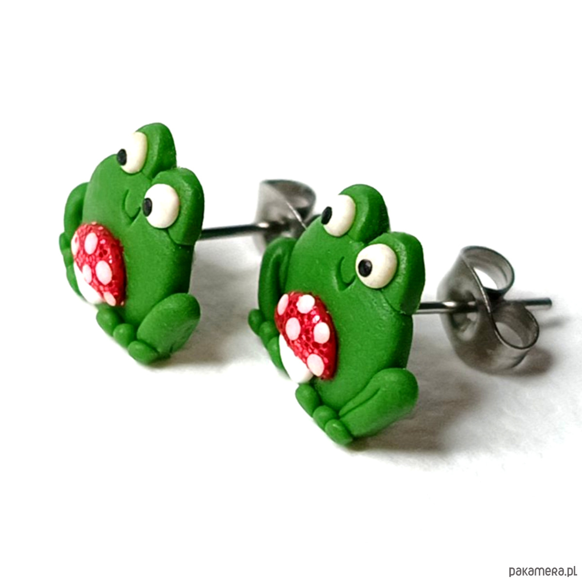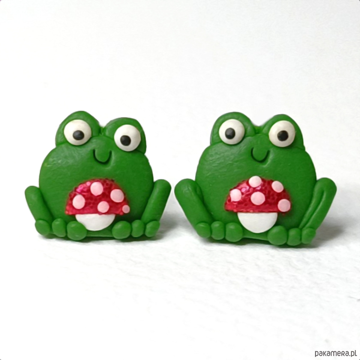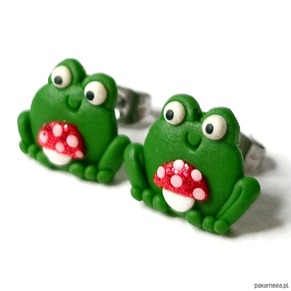 Urocze kolczyki sztyfty w kształcie zielonych żabek trzymających czerwone muchomorki. Ręcznie wykonane z masy polimerowej, zachwycają detalem i lekką, bajkową formą.