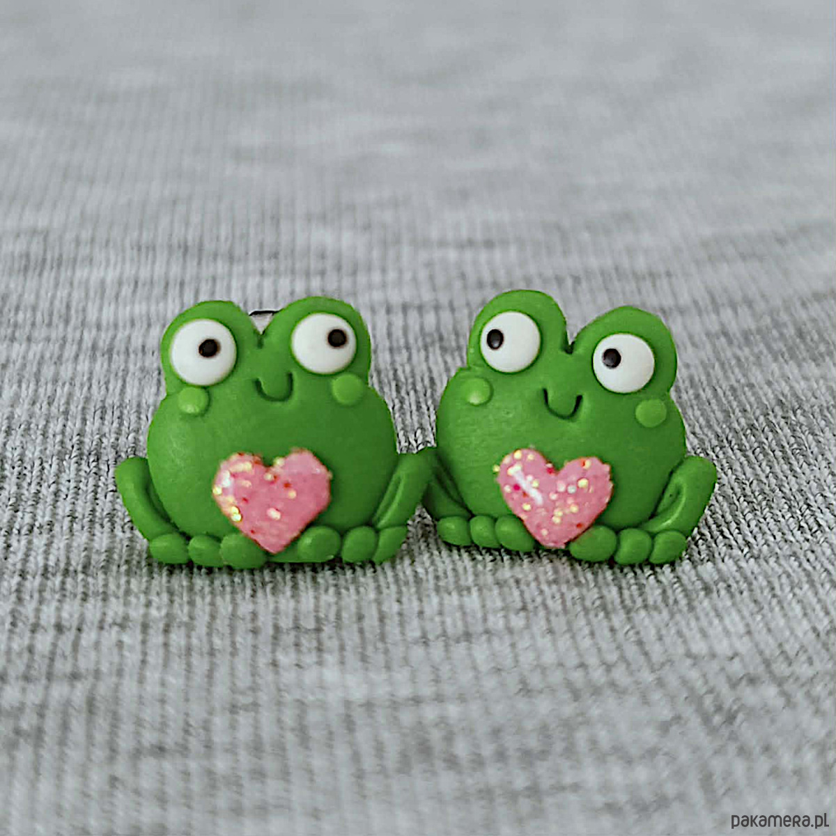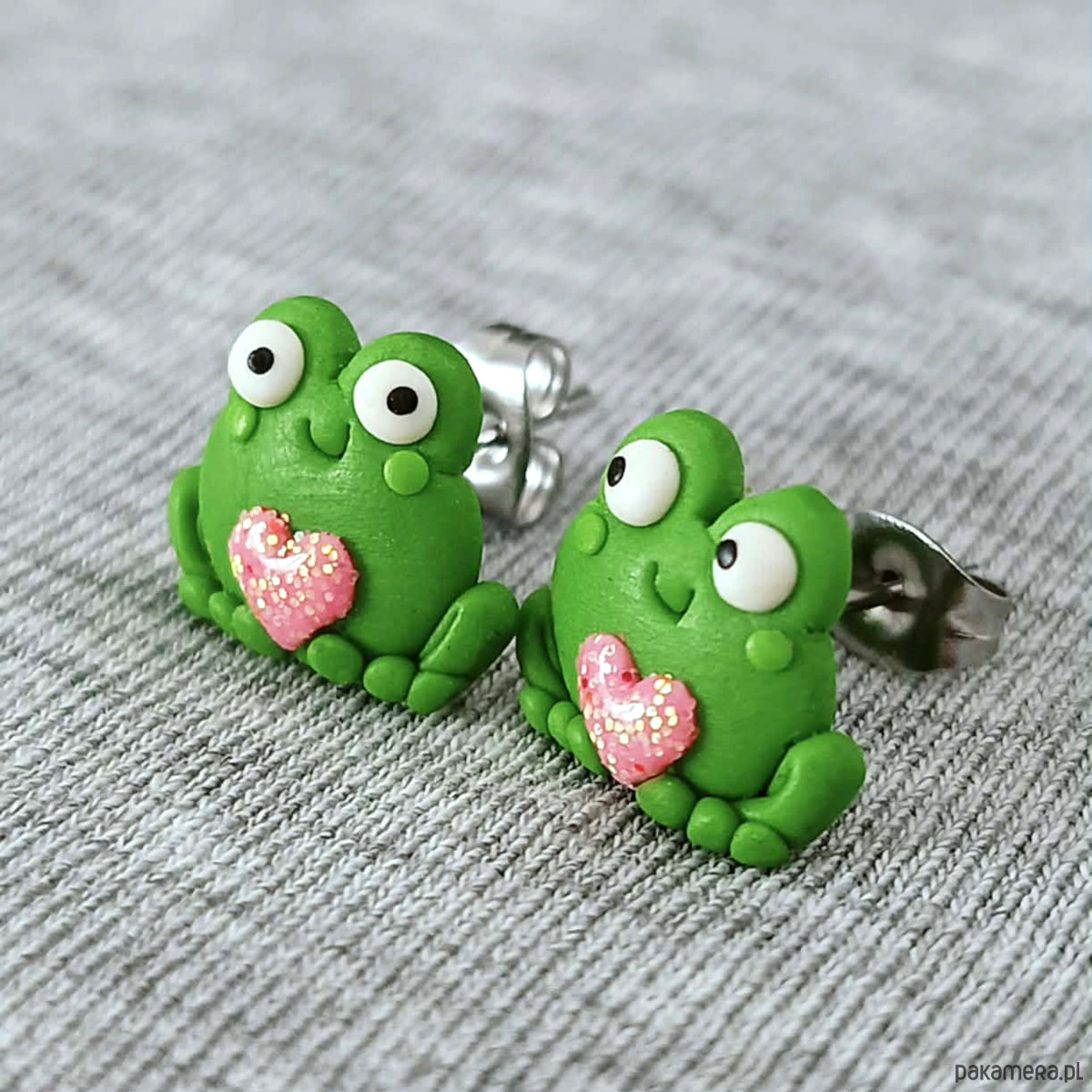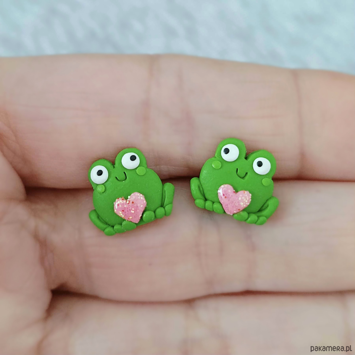 Urocze kolczyki sztyfty w kształcie zielonych żabek trzymających różowe serduszka.. Ręcznie wykonane z masy polimerowej, zachwycają detalem i lekką, bajkową formą.