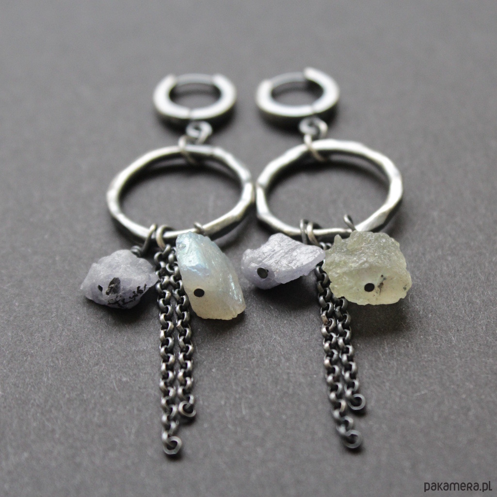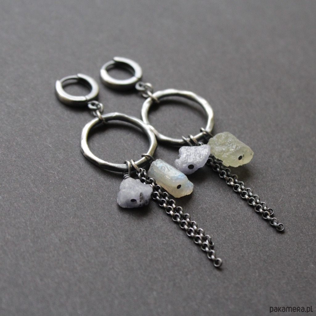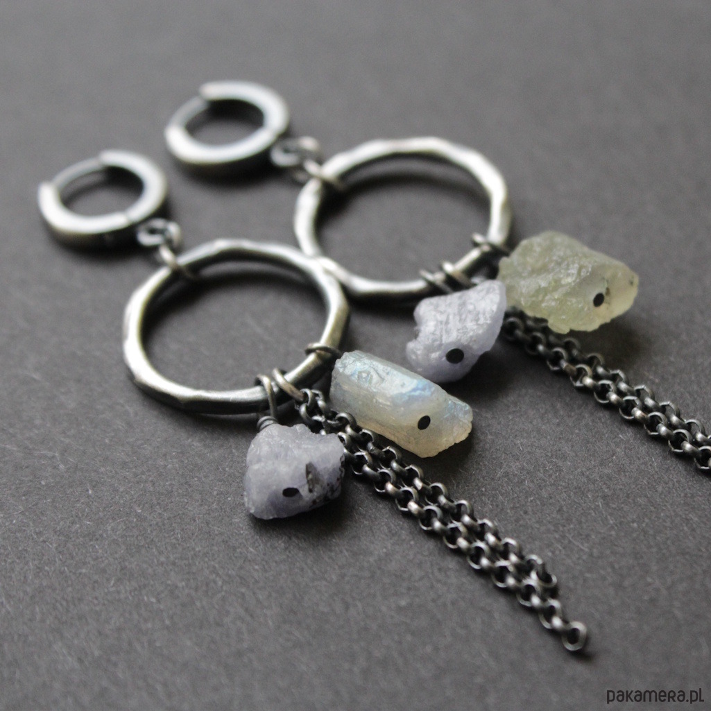 Oryginalne kolczyki wykonane zostały z oksydowanego srebra próby 925 oraz pięknych surowych bryłek labradorytó wielkośći 1 cm oraz tanzanitów 0,6-0,7 cm.
