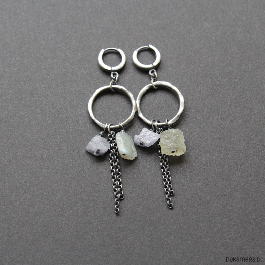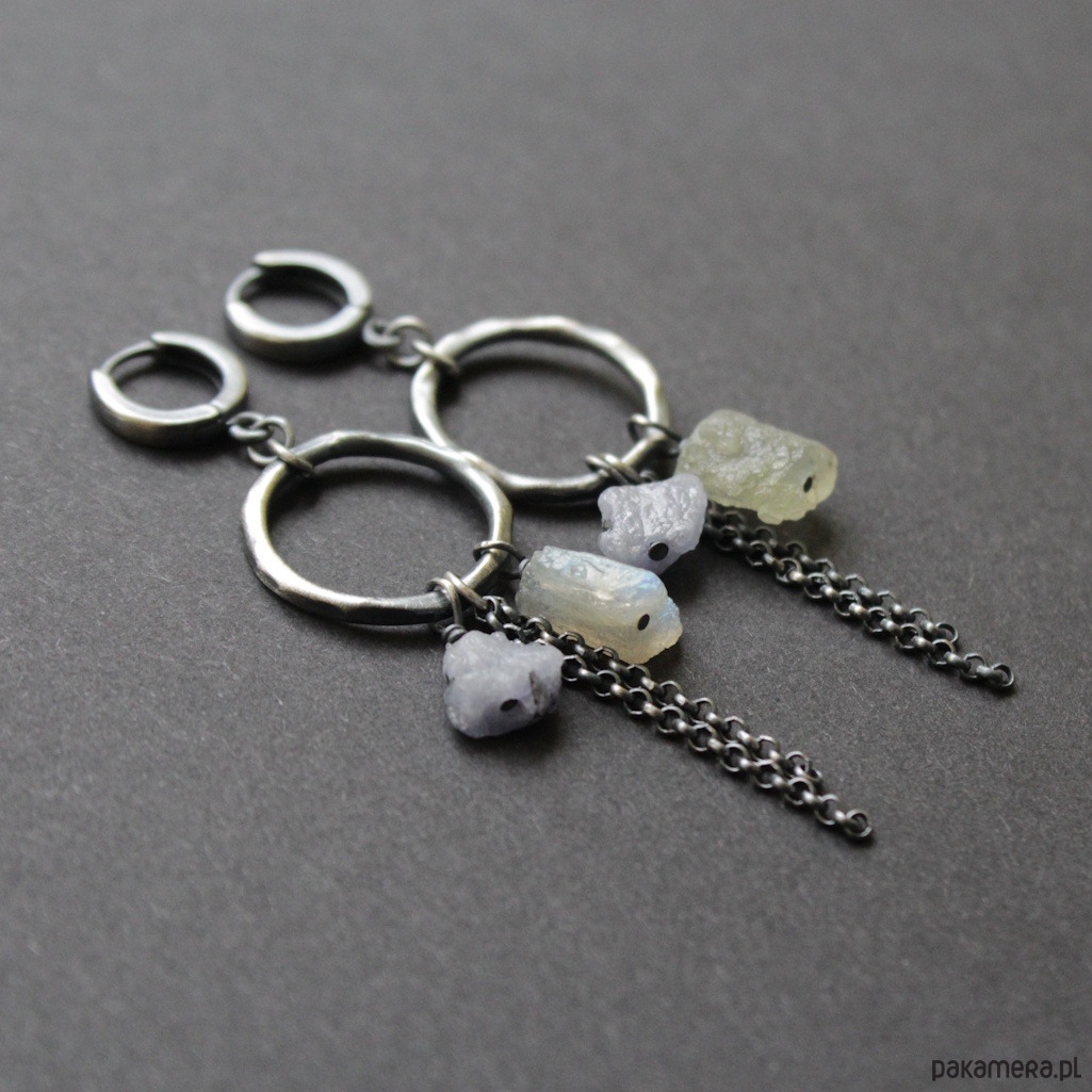 Oryginalne kolczyki wykonane zostały z oksydowanego srebra próby 925 oraz pięknych surowych bryłek labradorytó wielkośći 1 cm oraz tanzanitów 0,6-0,7 cm.