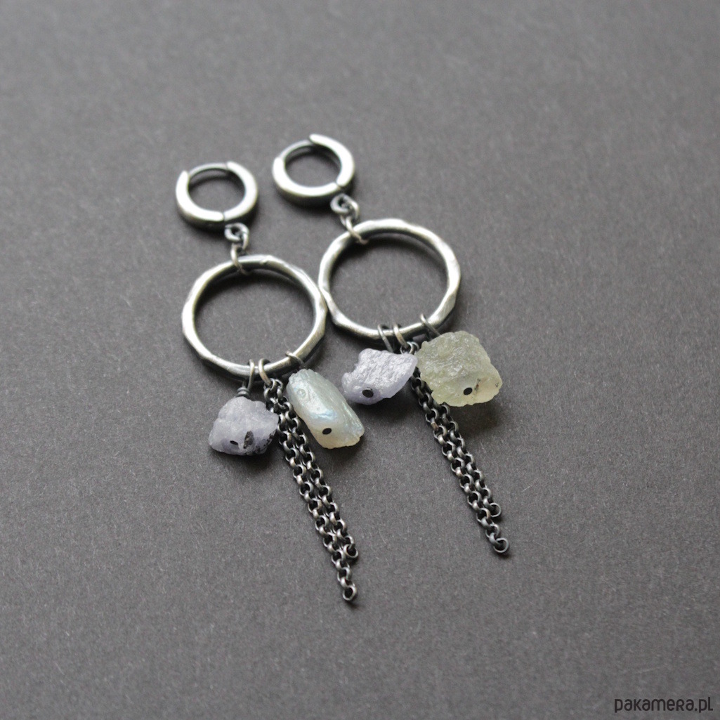 Oryginalne kolczyki wykonane zostały z oksydowanego srebra próby 925 oraz pięknych surowych bryłek labradorytó wielkośći 1 cm oraz tanzanitów 0,6-0,7 cm.