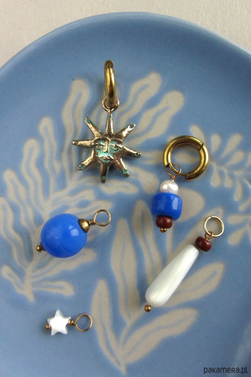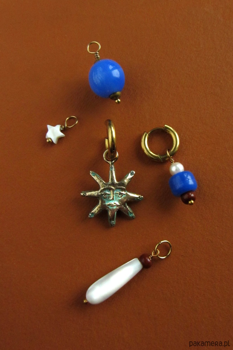 Kolczyki MIX&MATCH to seria, która pozwala na łączenie elementów na różne sposoby. Zestaw zawiera bazę z pozłacanej stali chirurgicznej, ręcznie rzeźbioną zawieszkę z brązu oraz cztery dodatkowe zawieszki wykonane z pereł, macicy perłowej oraz szkła. Wymienne elementy umożliwiają łączenie na różne sposoby i zabawę kształtami i kolorem.