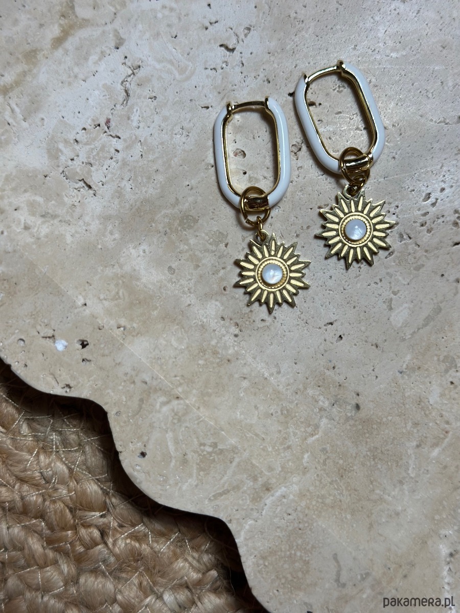 Kolczyki złocone ze słońcem . Kolczyki ze stali szlachetnej emaliowane. Zawieszki wykonanane ze stali szlachetnej trwale barwione z elementem z masy perłowej. Idealny elementy biżuteryjny dla osób lubujących się w delikatnych akcentach .