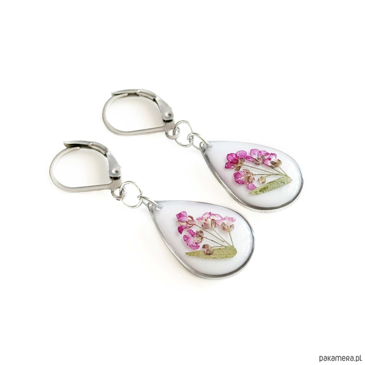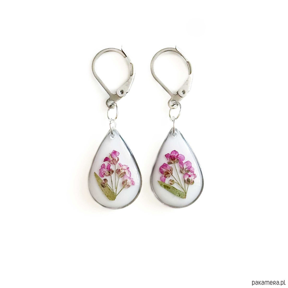 Kolczyki wiszące wykonane ze stali szlachetnej oraz żywicy epoksydowej.