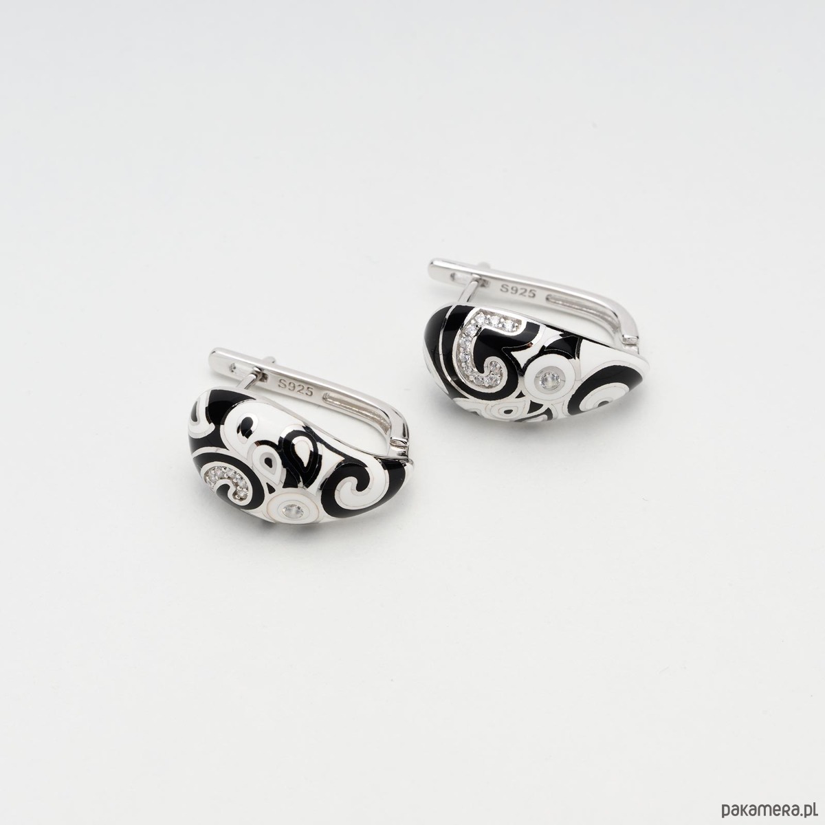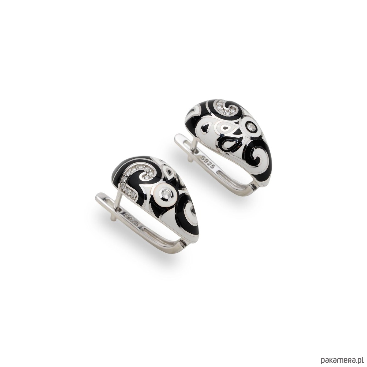 Kolczyki ze srebra 925 rodowane z cyrkoniami i czarno białą emalią
