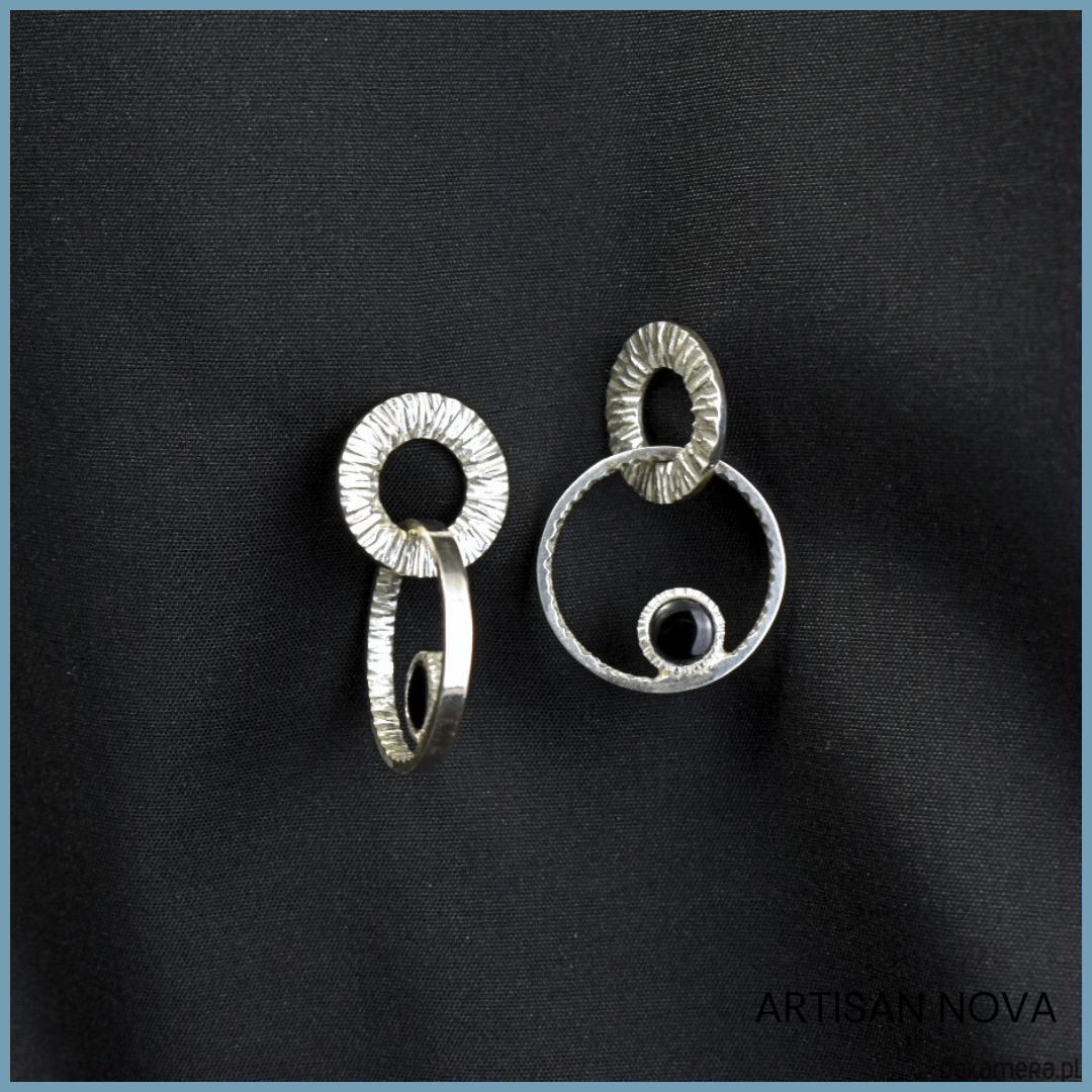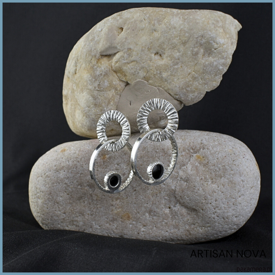 W dolnym kółku umieszczone zostały głęboko czarne onyksy. Kamień ten od wieków uznawany jest za symbol siły i elegancji, co sprawia, że jest idealnym akcentem dla ponadczasowego stylu. Co więcej, kółka kolczyków są ozdobione grawerowaną fakturą, co dodaje im stylu i unikatowego charakteru. Reszta elementów została wykończona na wysoki połysk, dzięki czemu powierzchnia jest gładka i lustrzana.